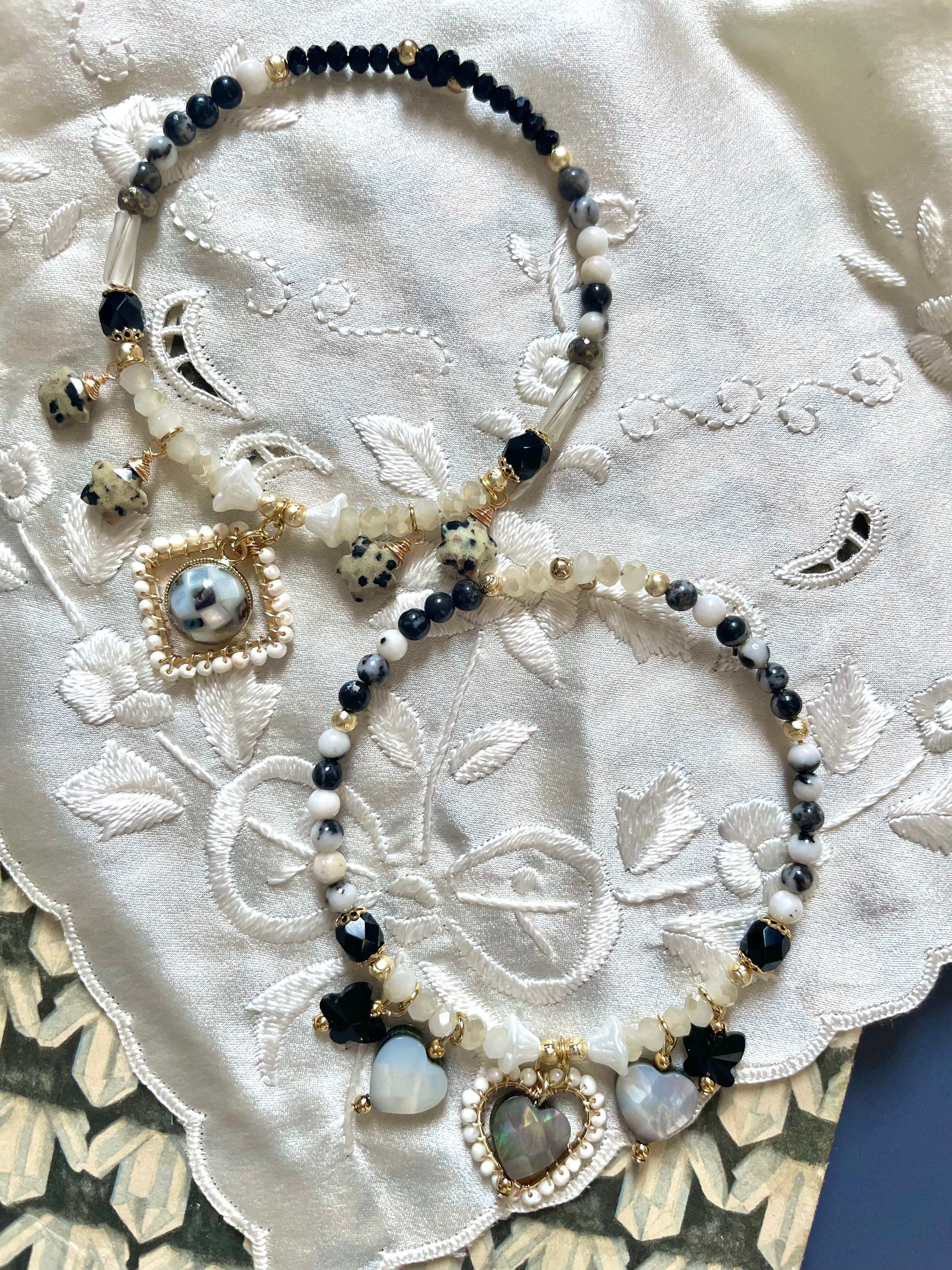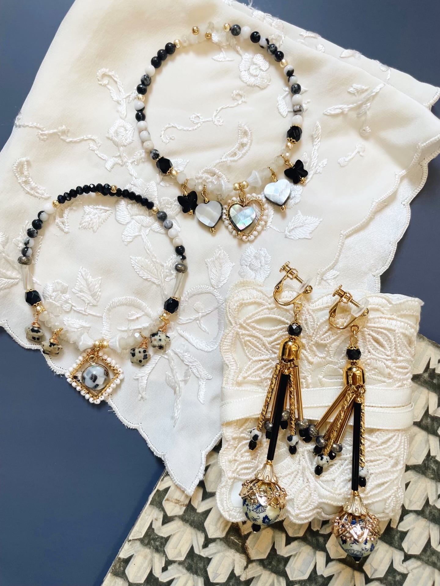 素材:ガラス、貝、淡水パール、ガラス、ゼブラジャスパー、チェコビーズなど