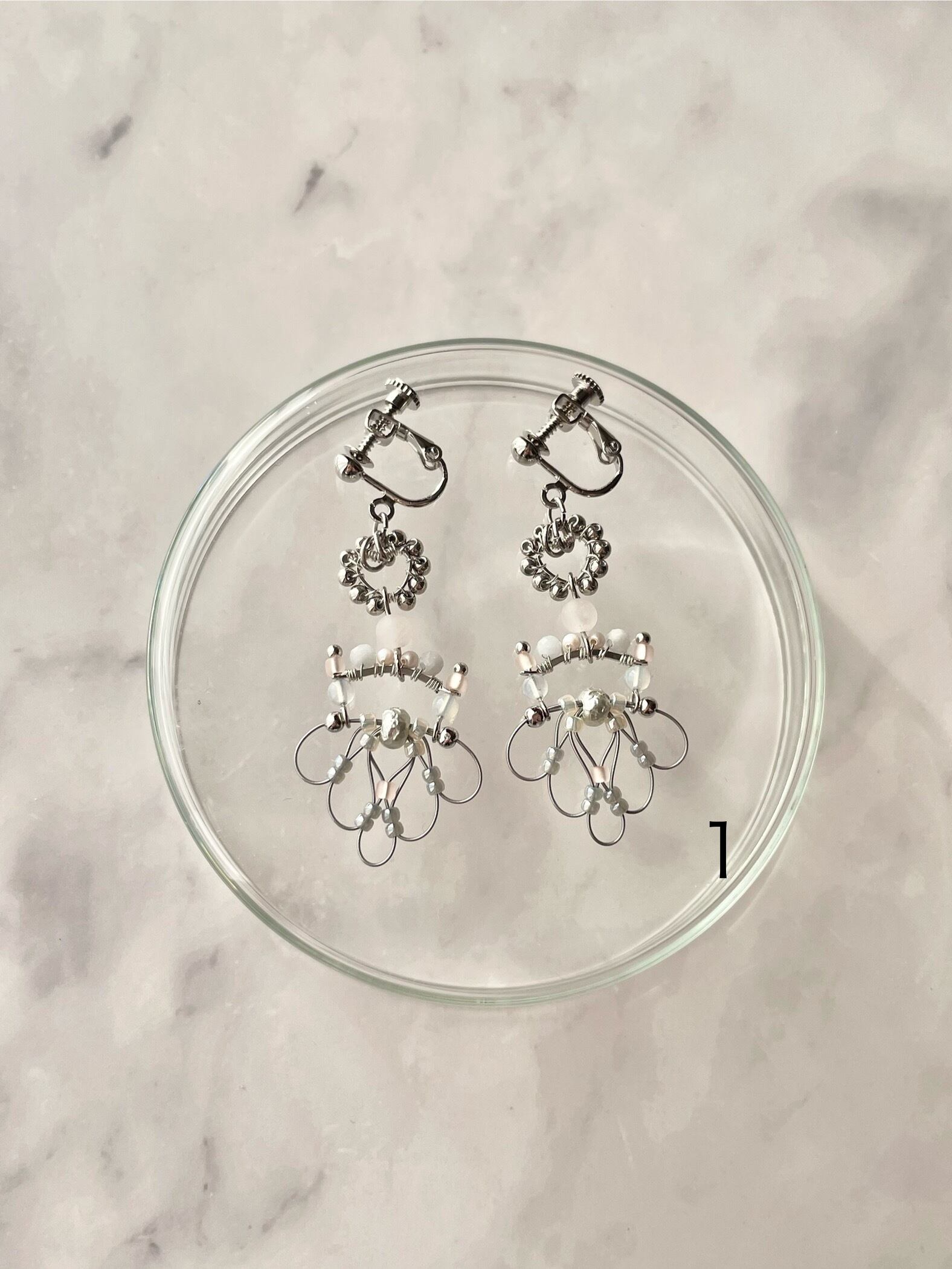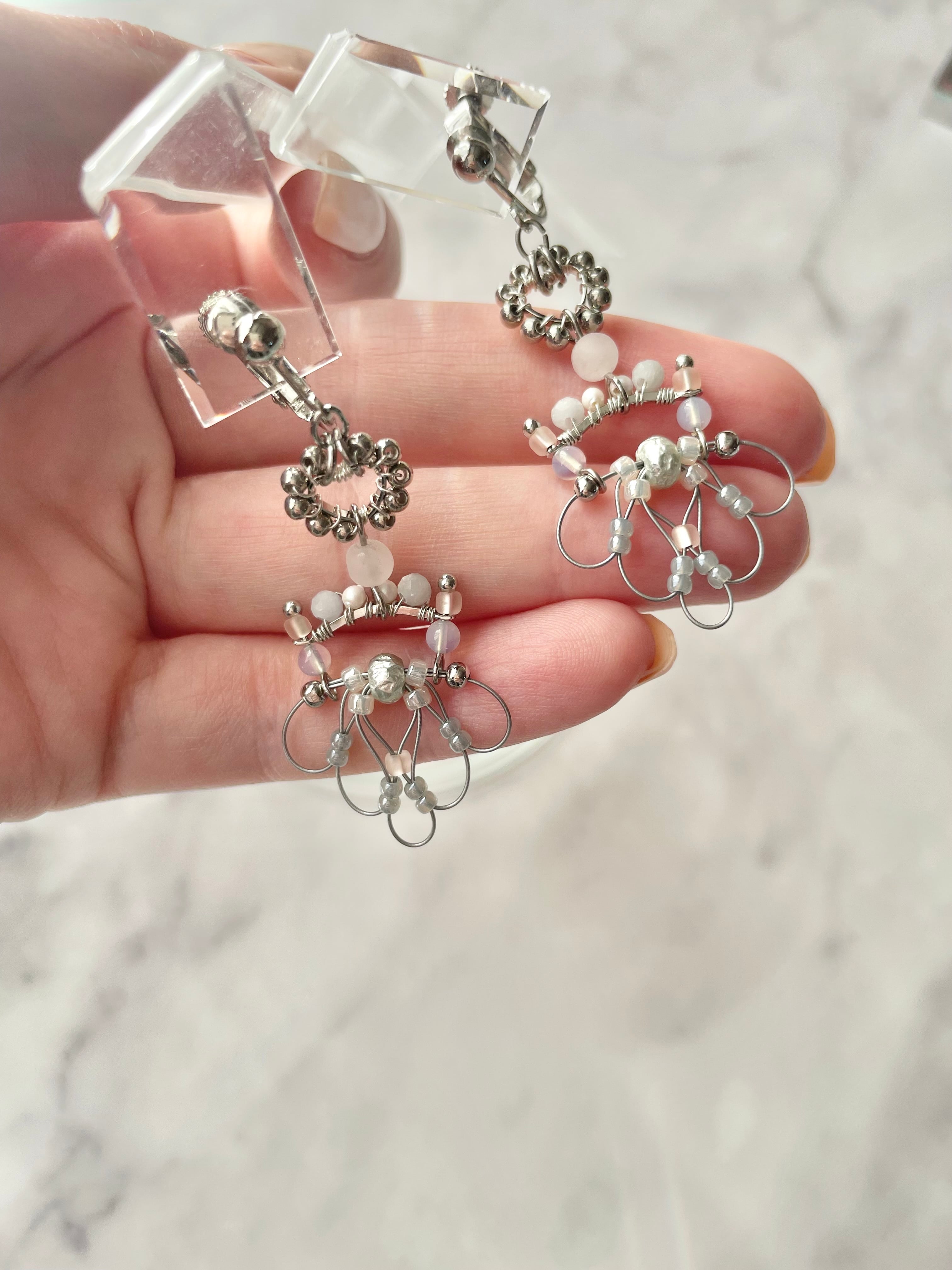 ワイヤー巻きのパーツとナイロンコートワイヤーで作ったパーツを組み合わせた華奢な耳飾りです