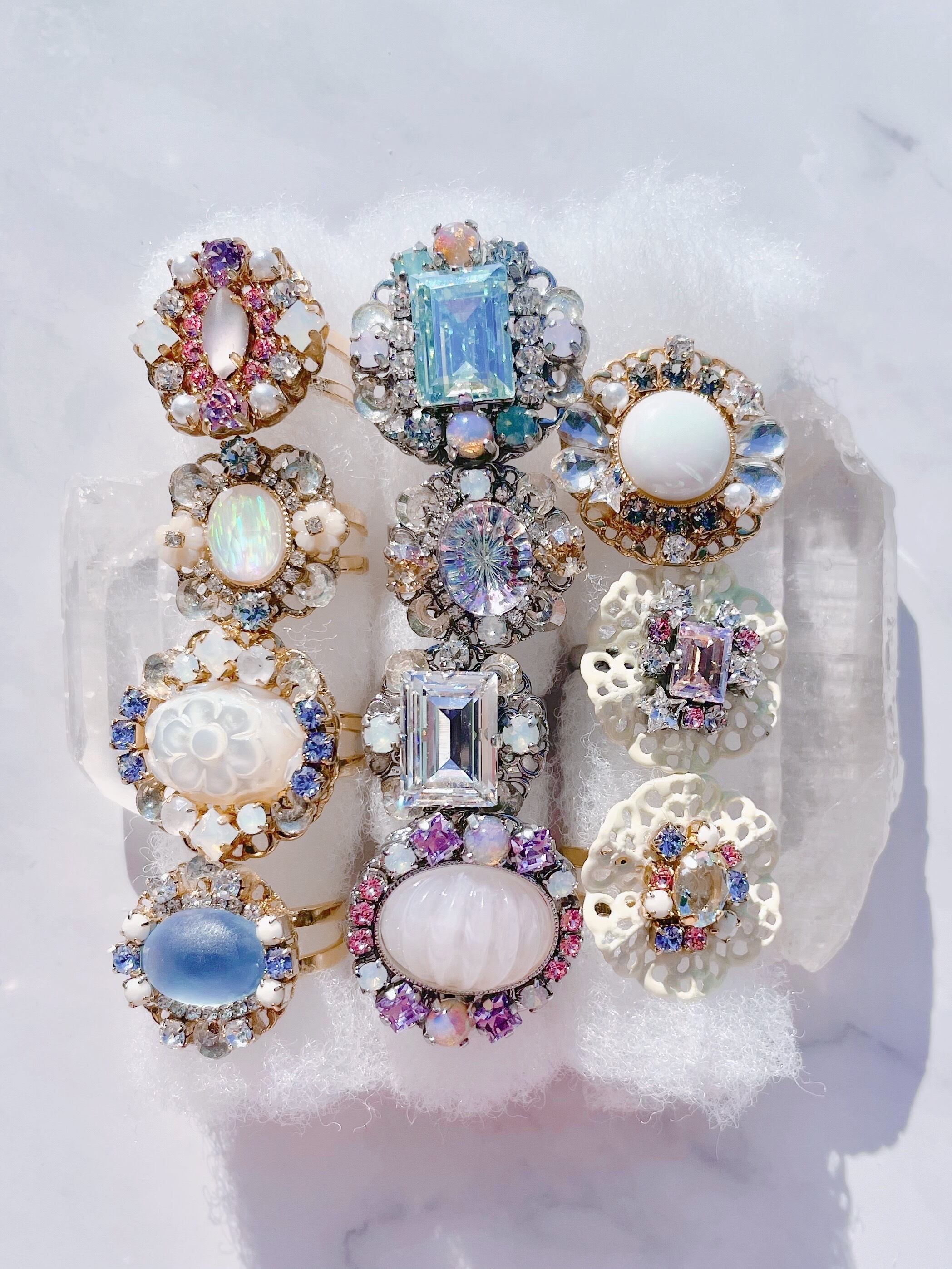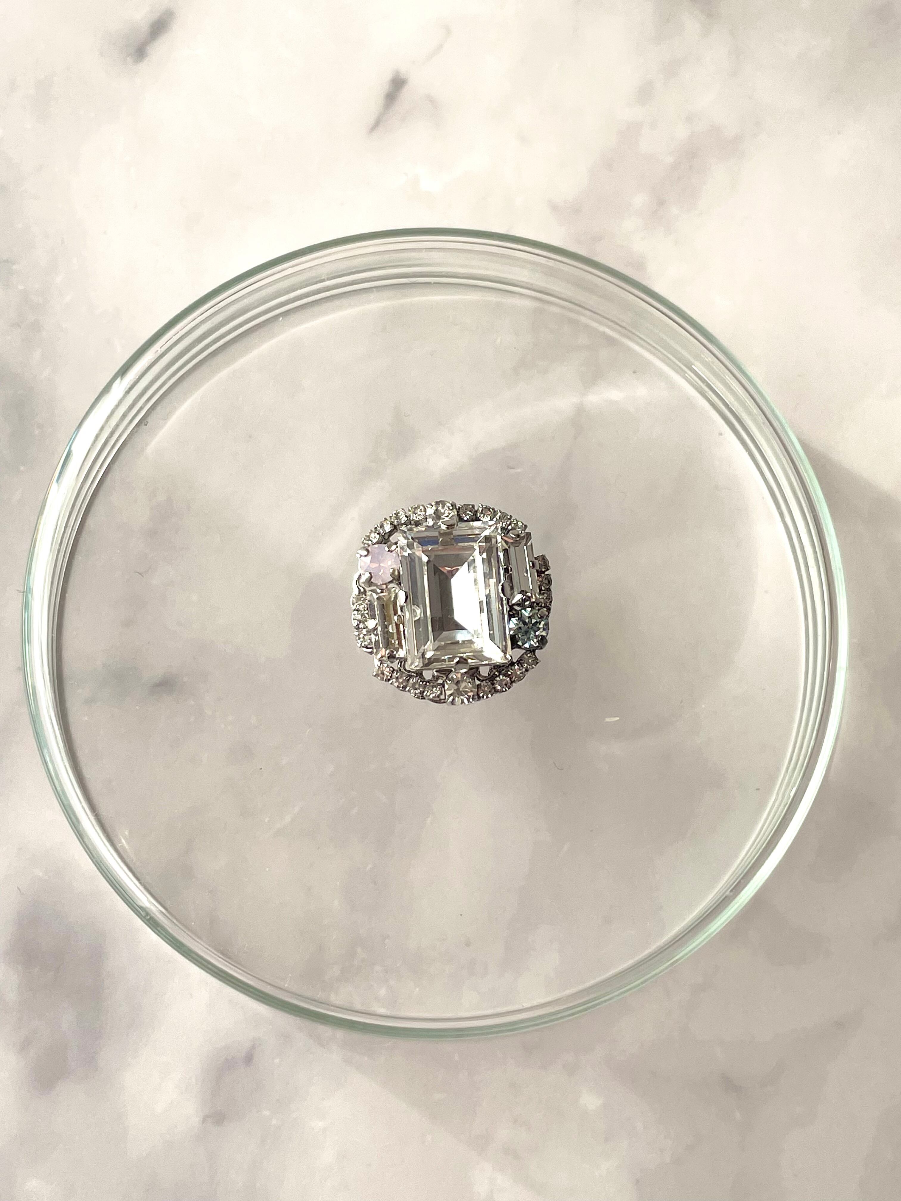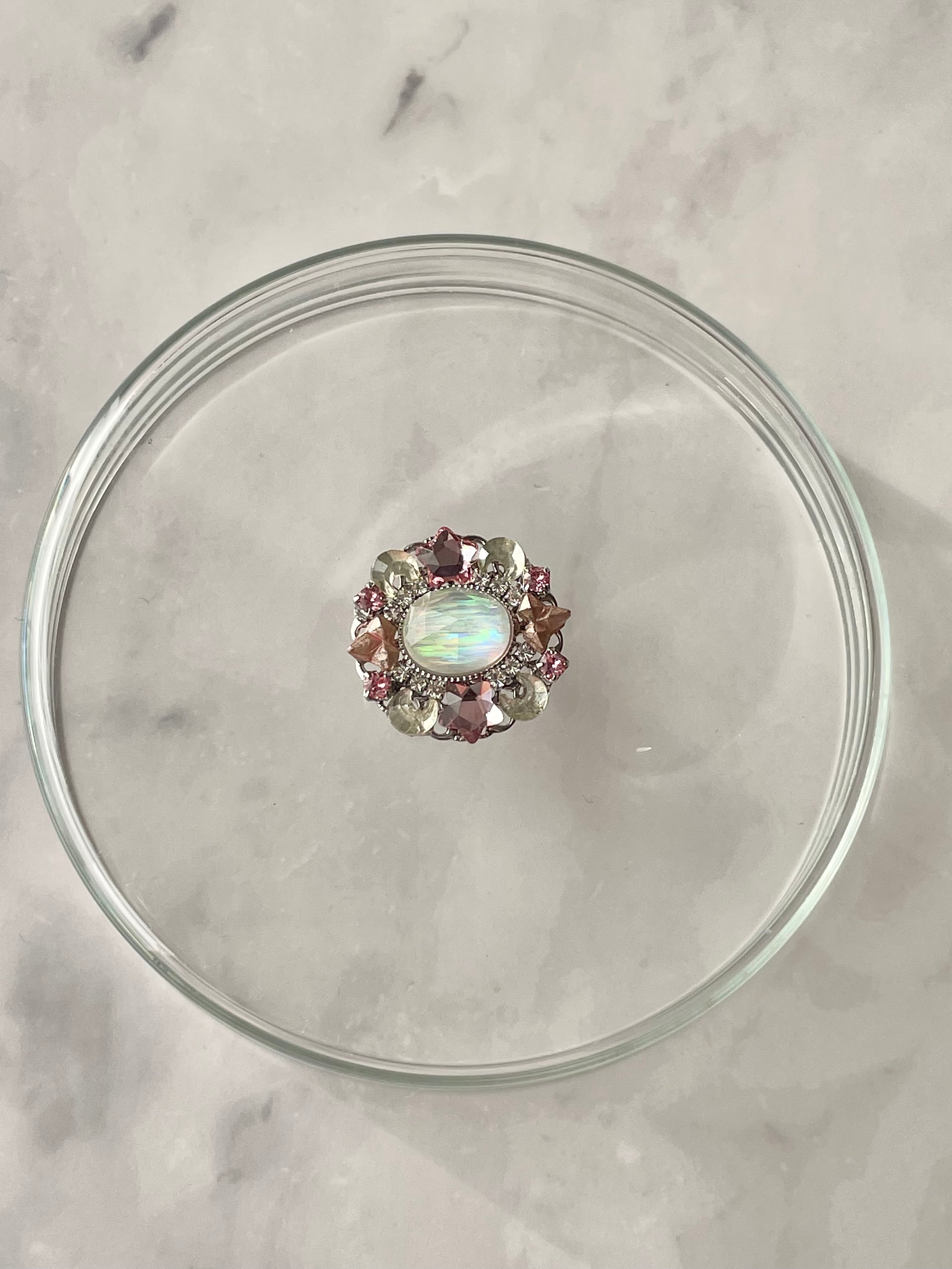 丸い土台に色とりどりのガラスやヴィンテージパーツをのせたリングです(接着剤使用)