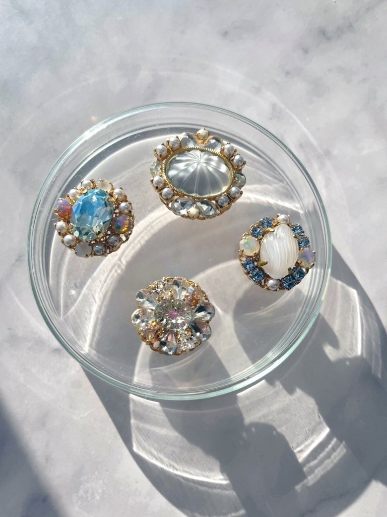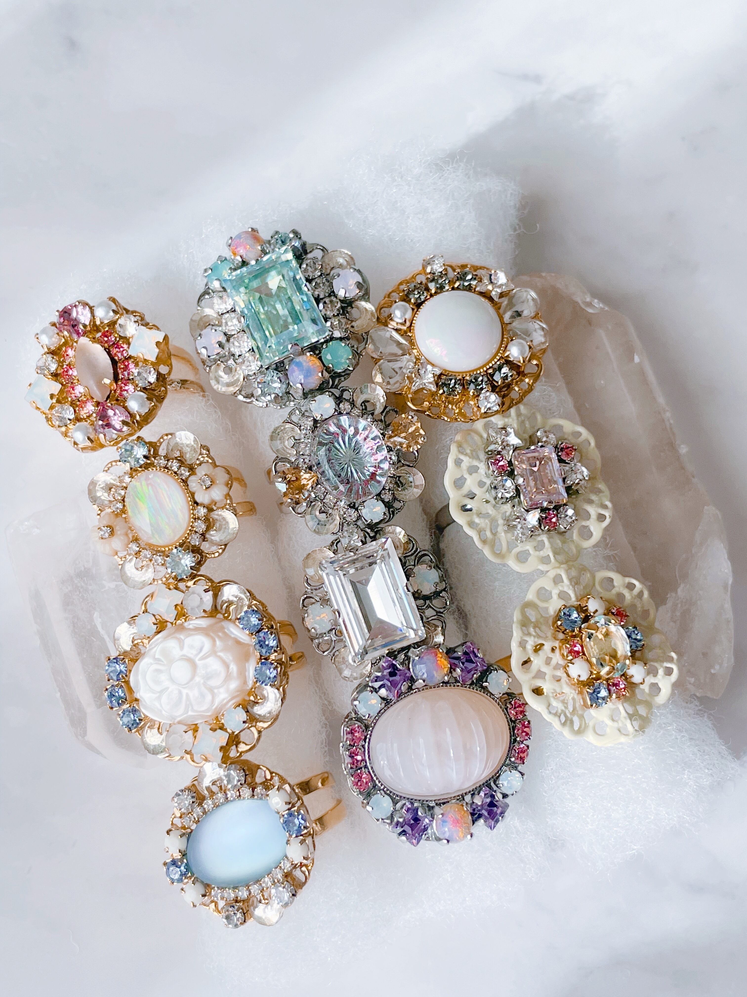 丸い土台に色とりどりのガラスやヴィンテージパーツをのせたリングです