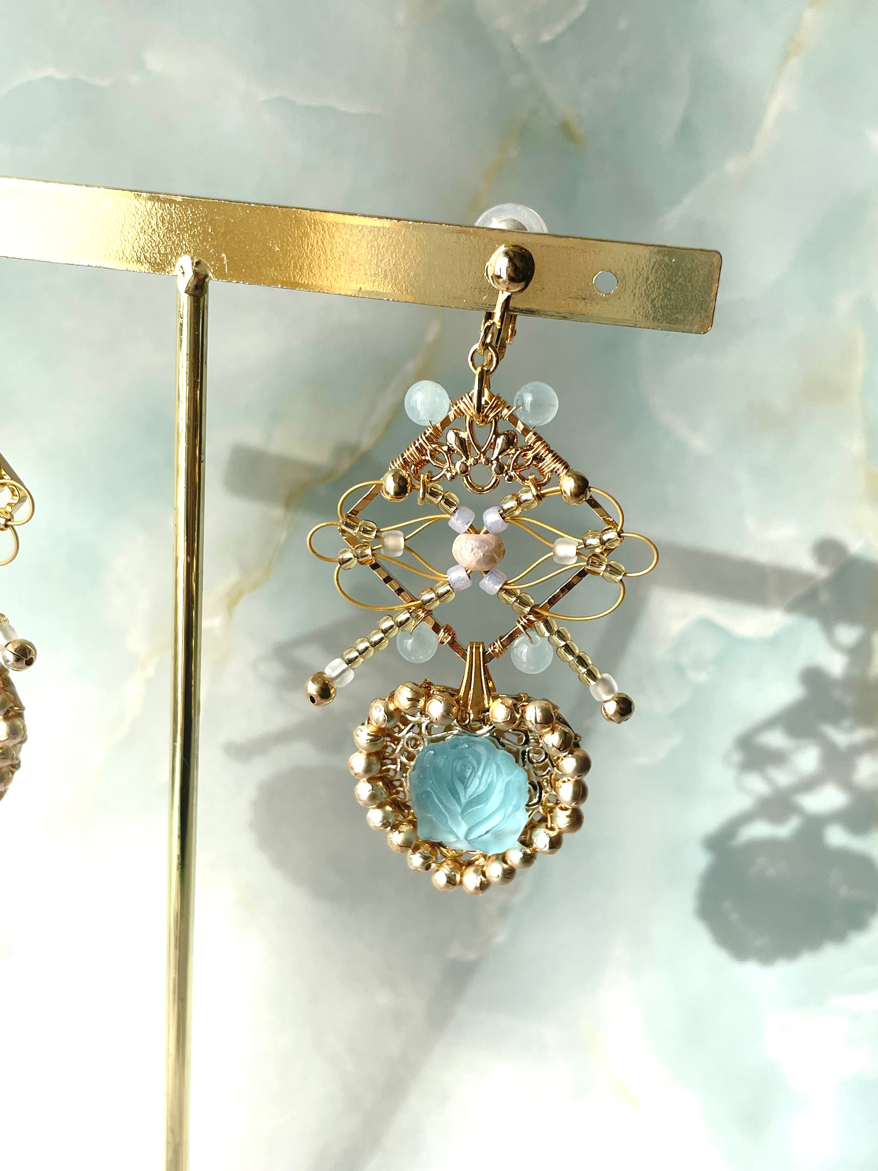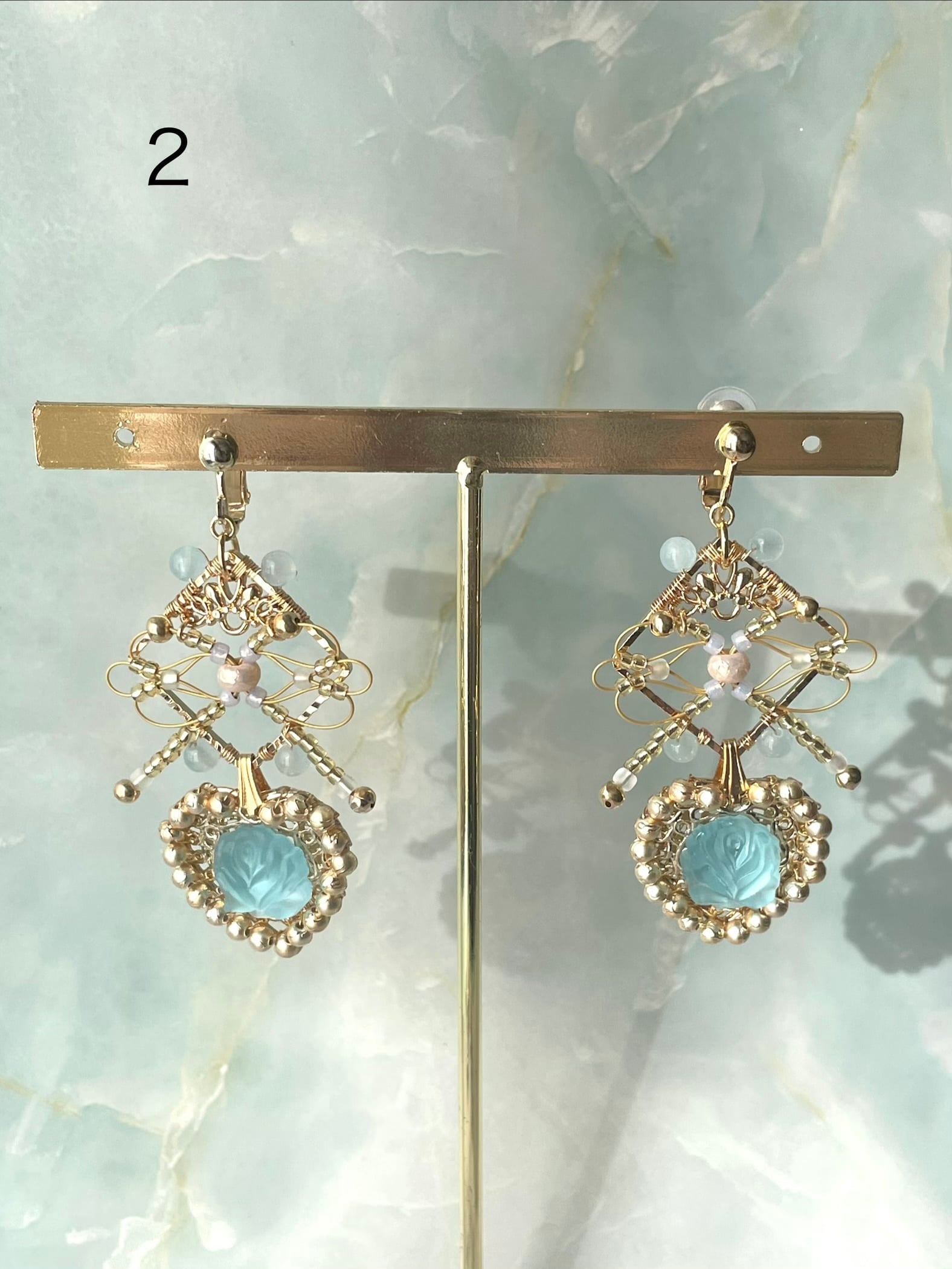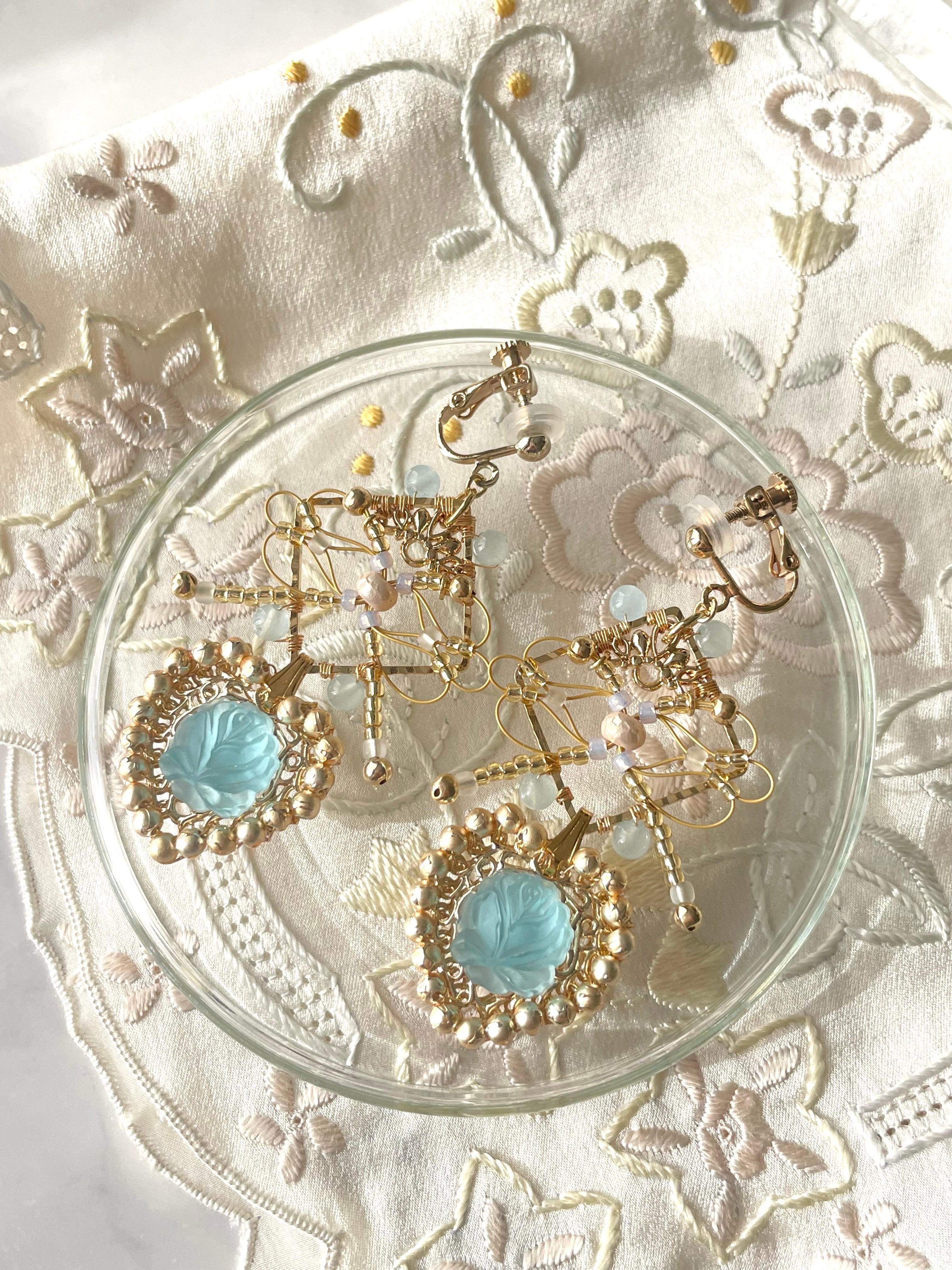 中央下の水色のお花のカボションはヴィンテージパーツです