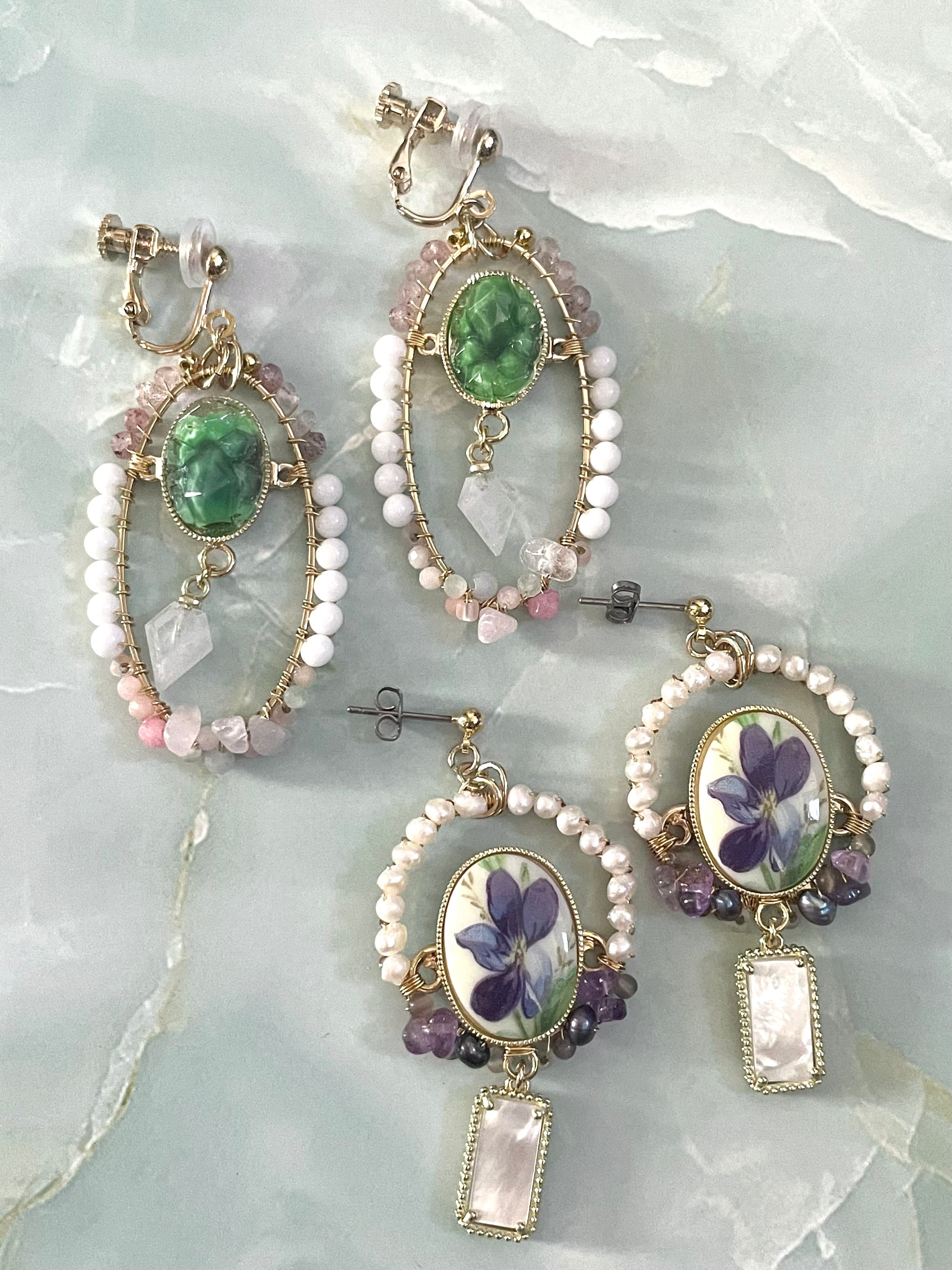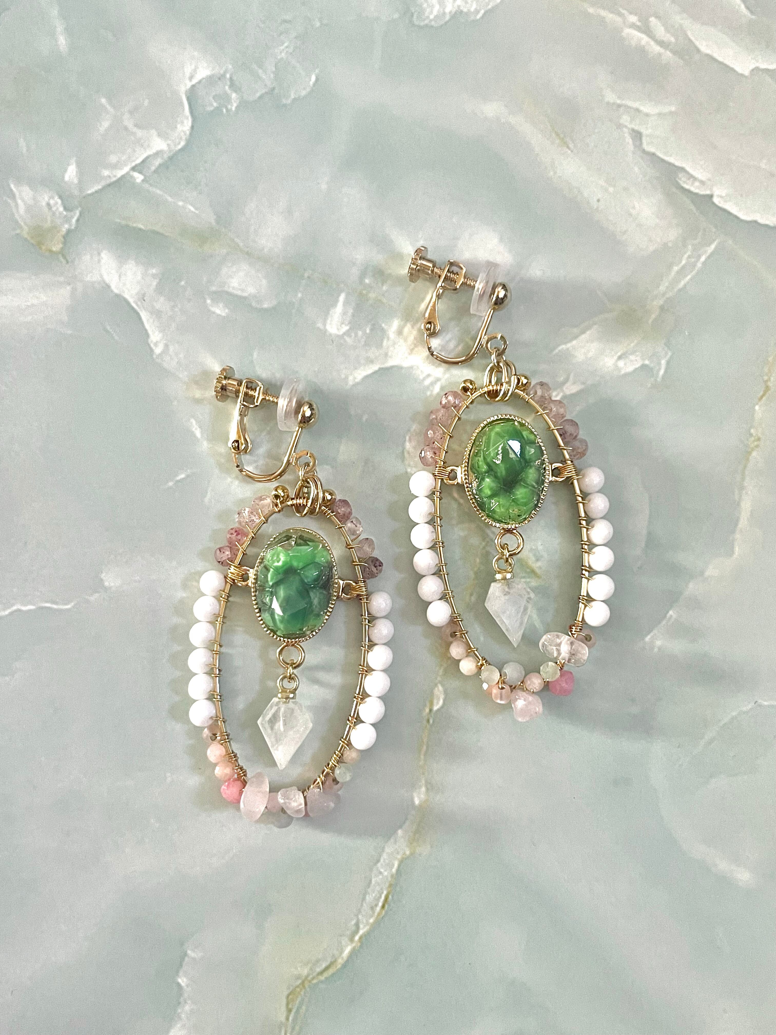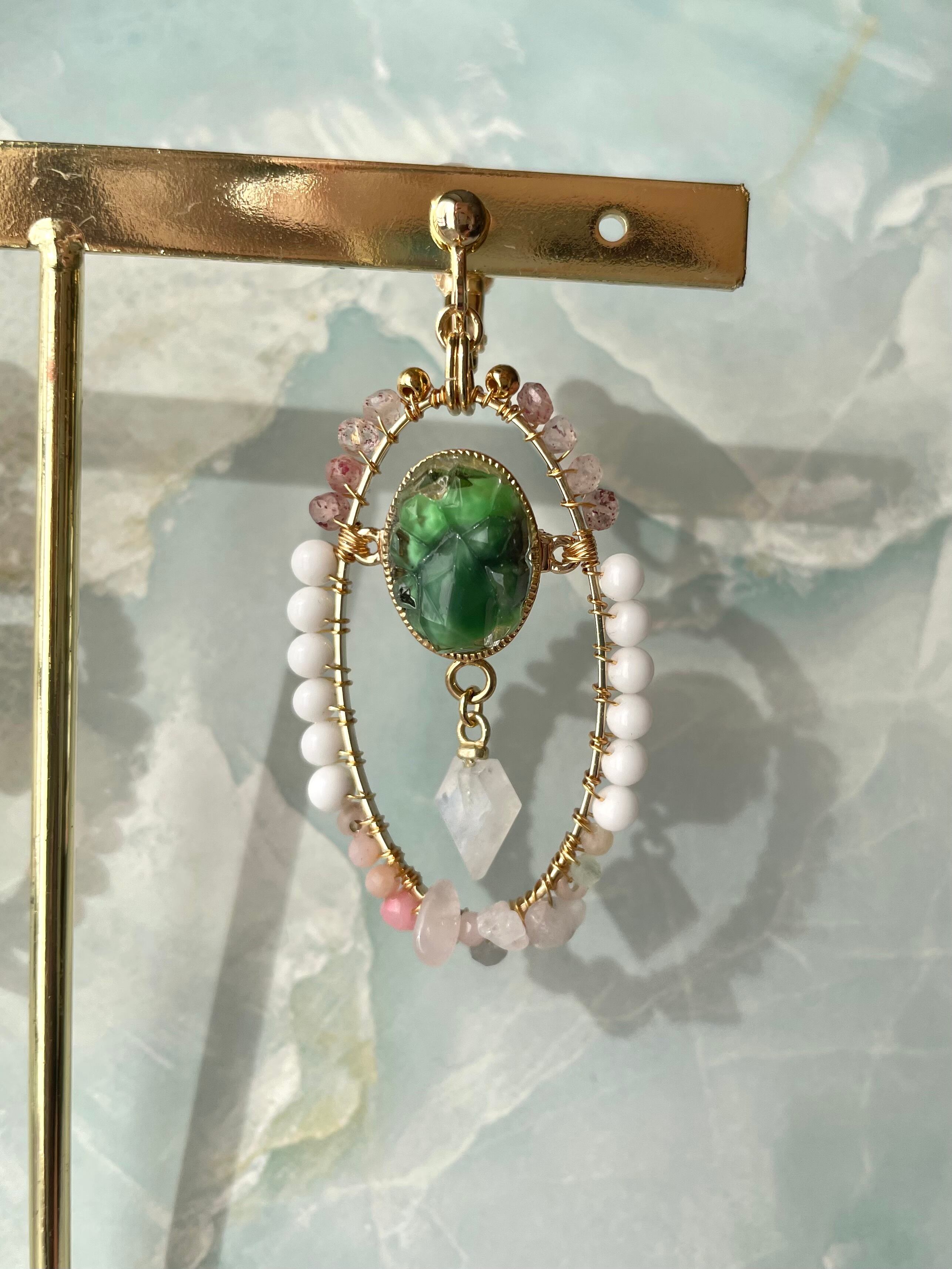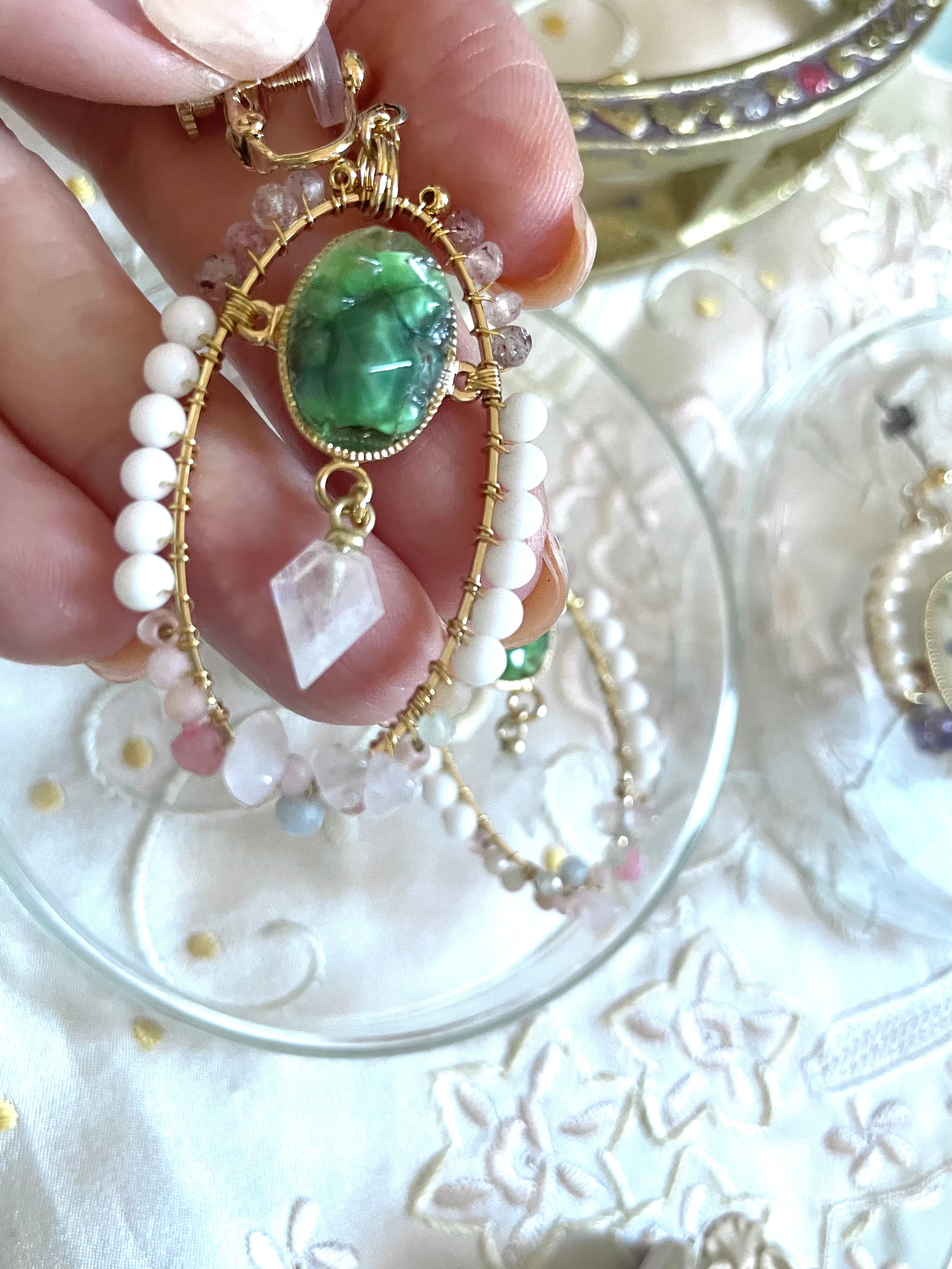 素材:ガラス、真鍮、エピドート、シェル、ローズクォーツ、エンジェライト、レインボームーンストーンなど