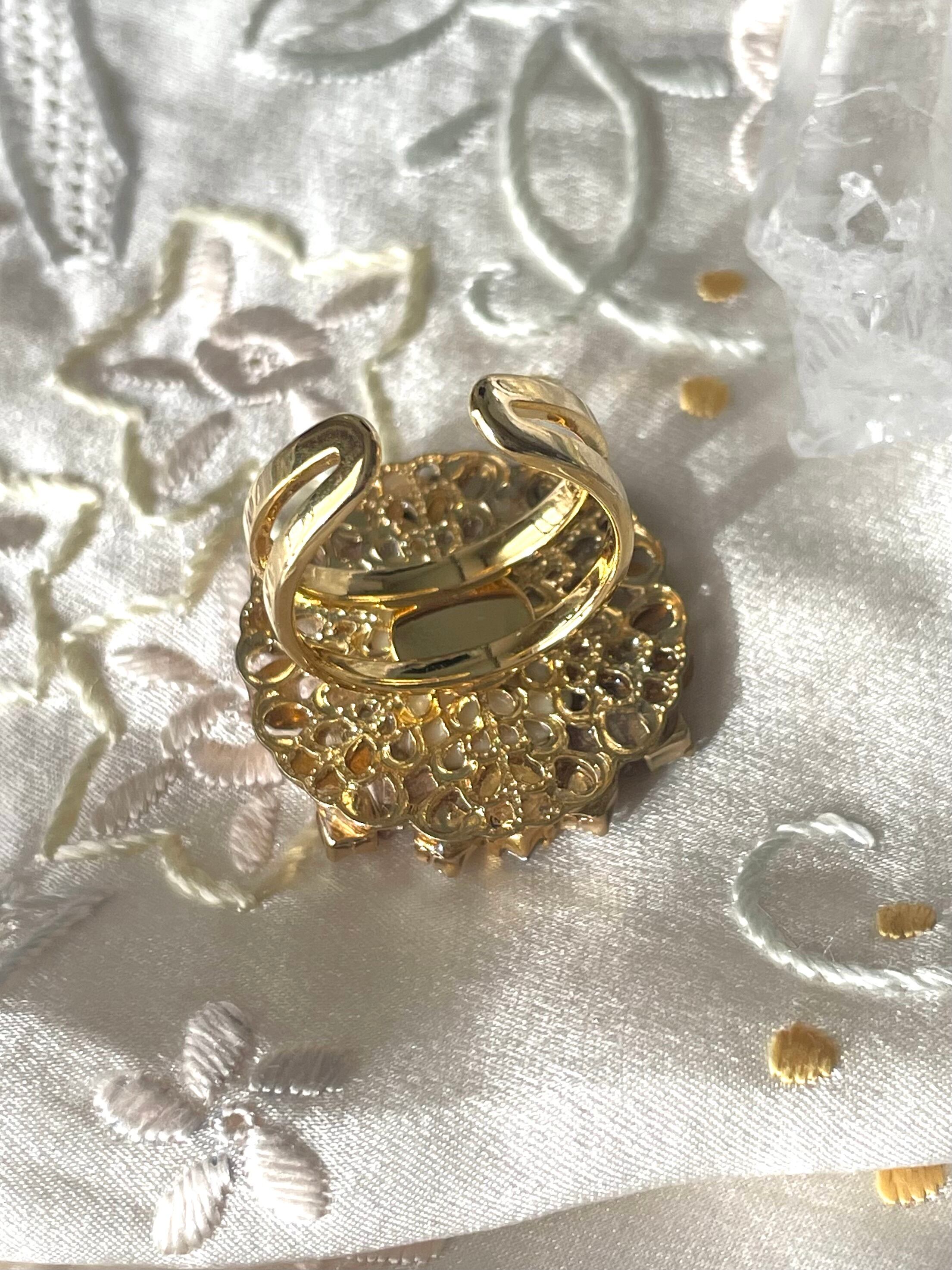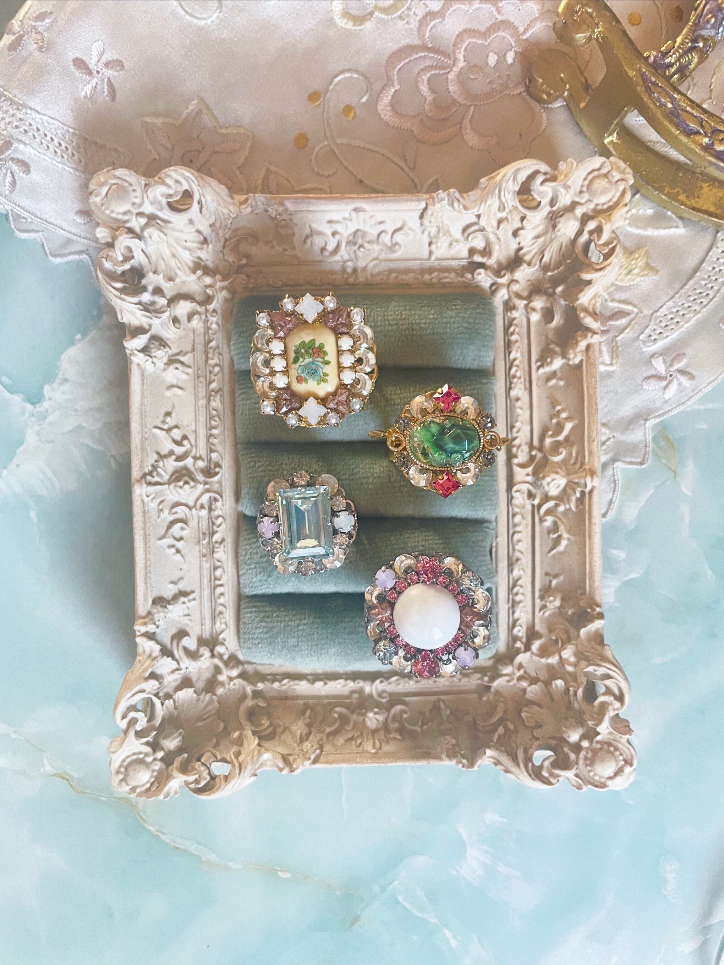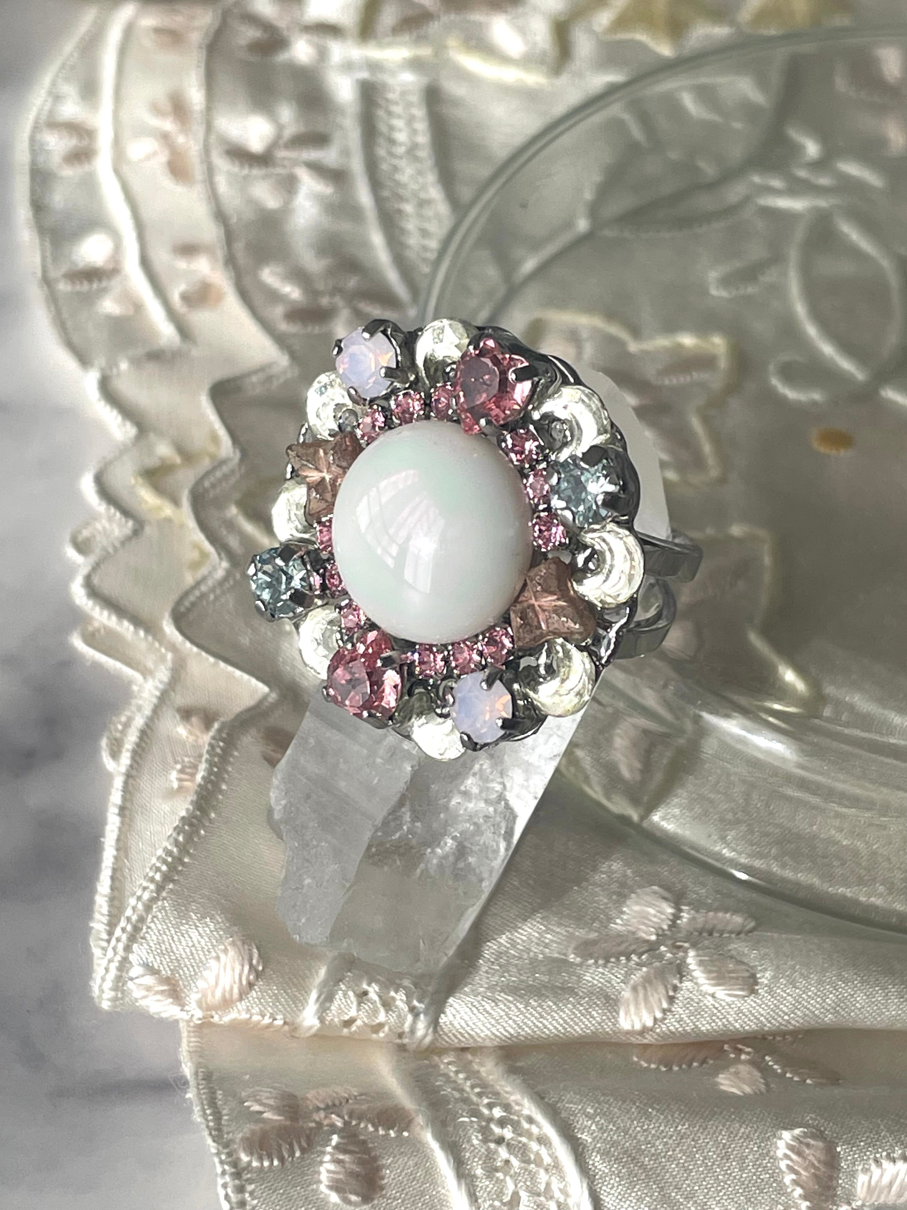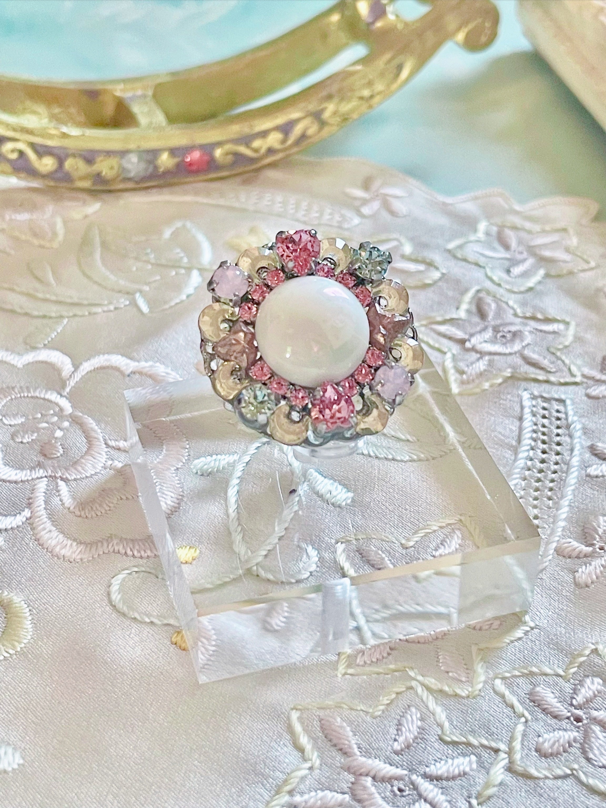 中央の花模様のカボション、周りのピンクの菱形を組み合わせたようなパーツ、三日月型(ガラス)のパーツはヴィンテージです