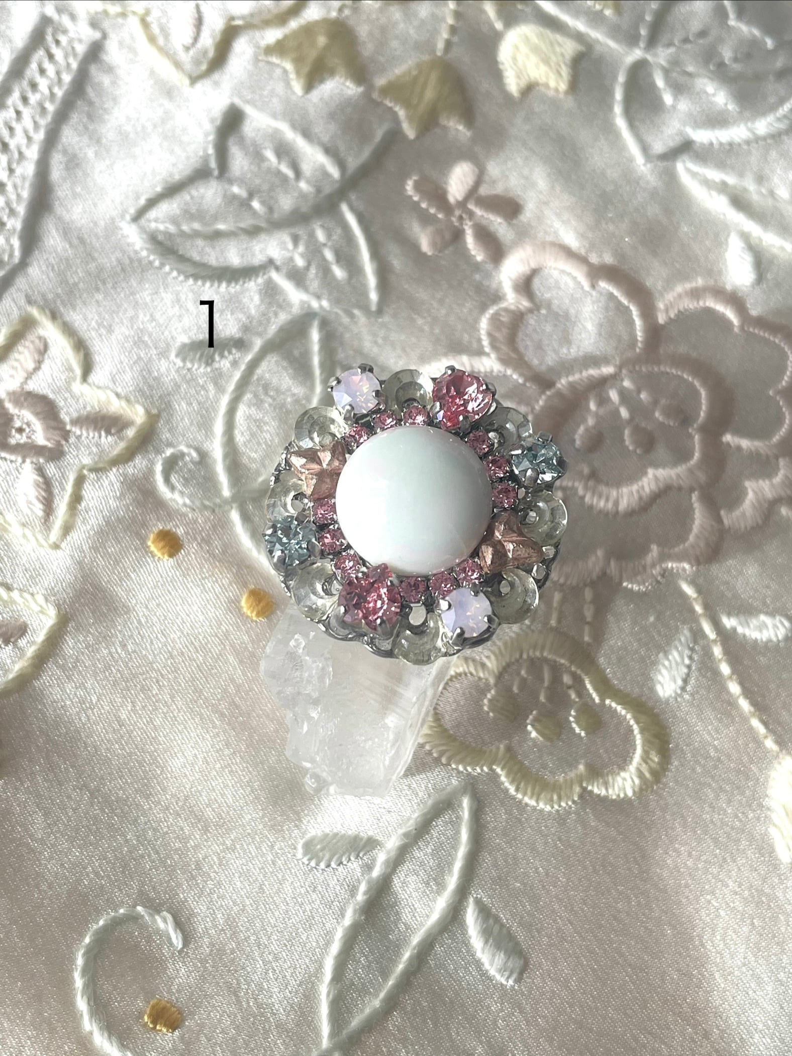 中央の白い丸(ガラス)、周りの三日月型(ガラス)のパーツはヴィンテージです