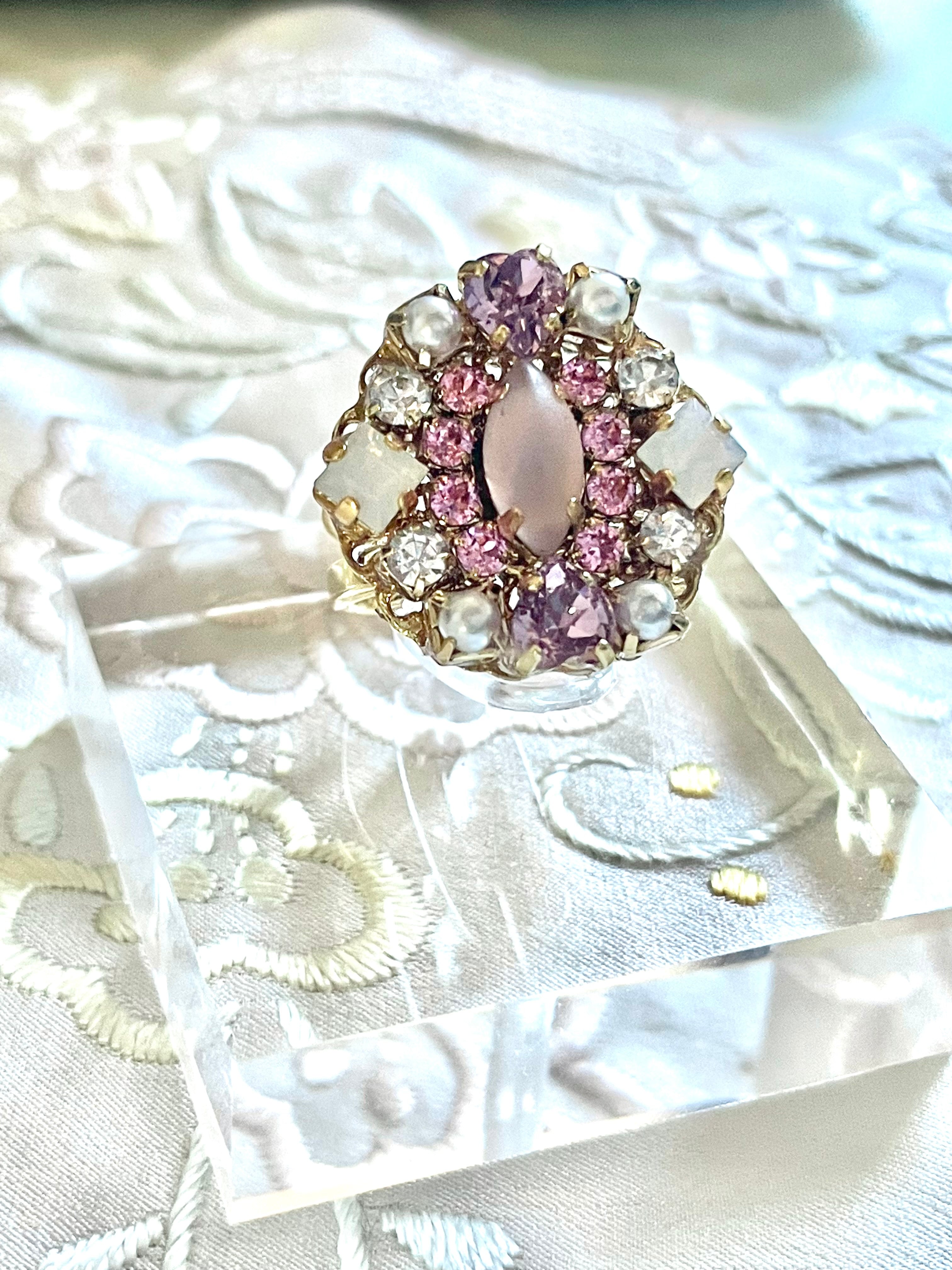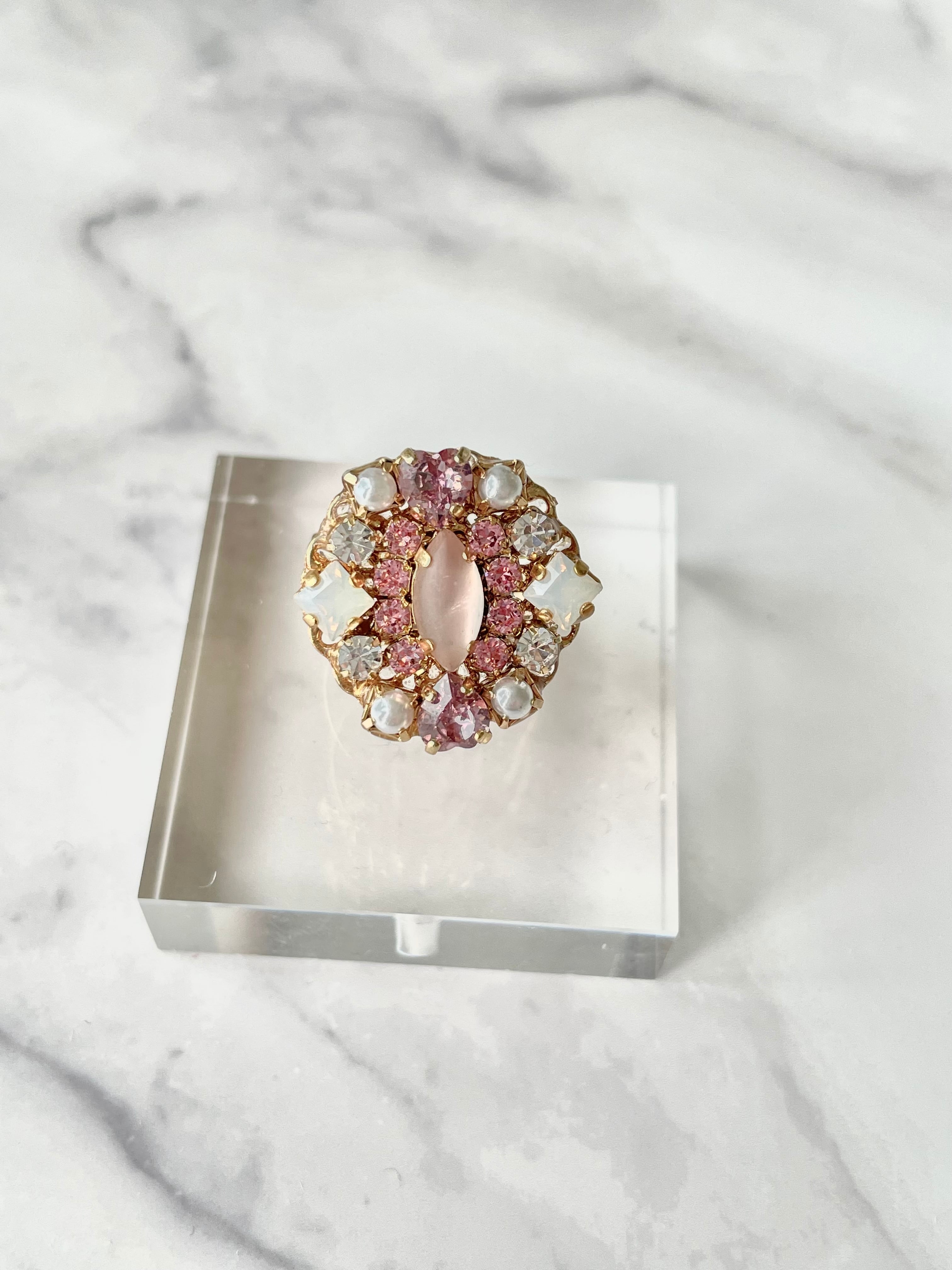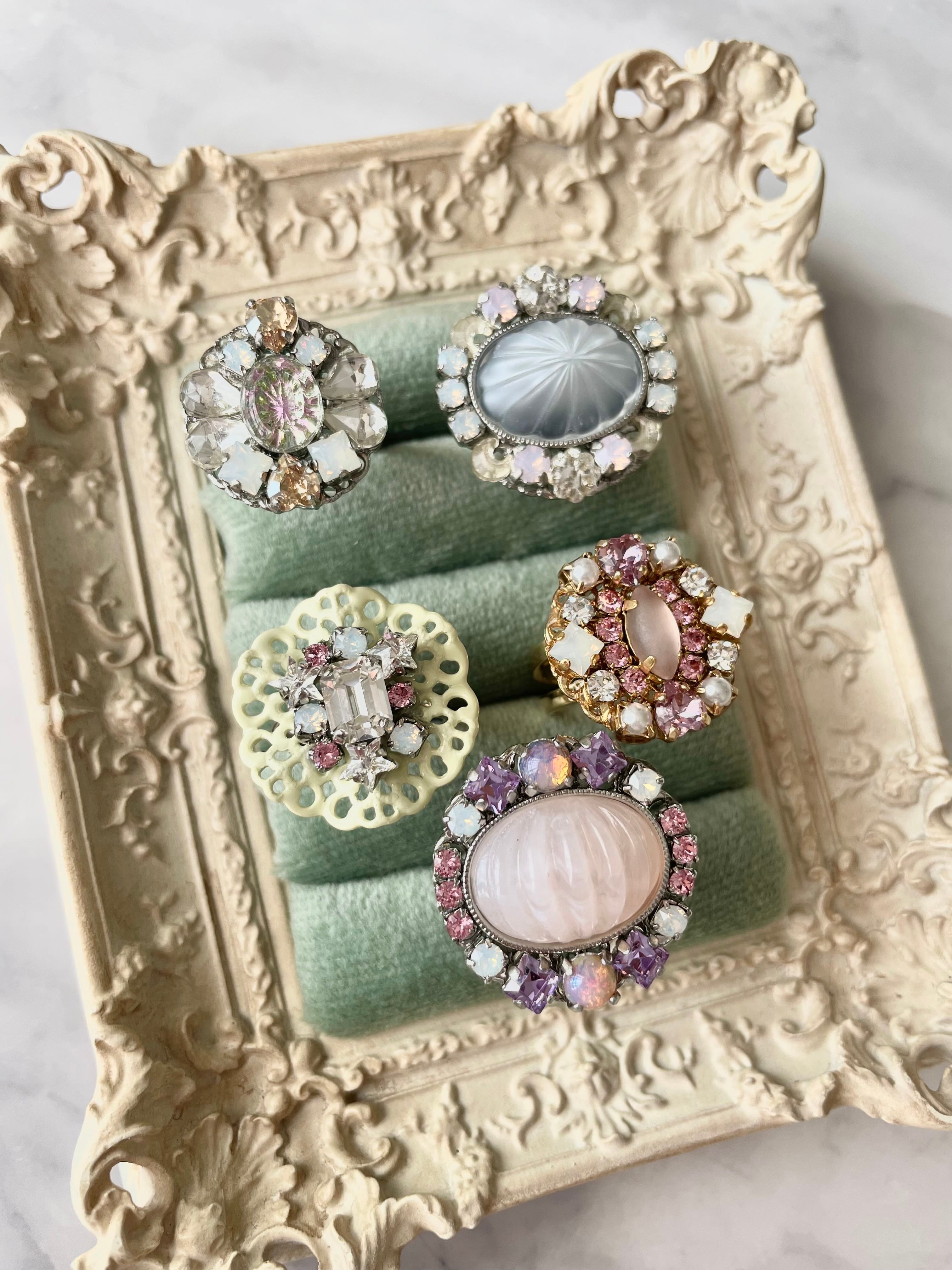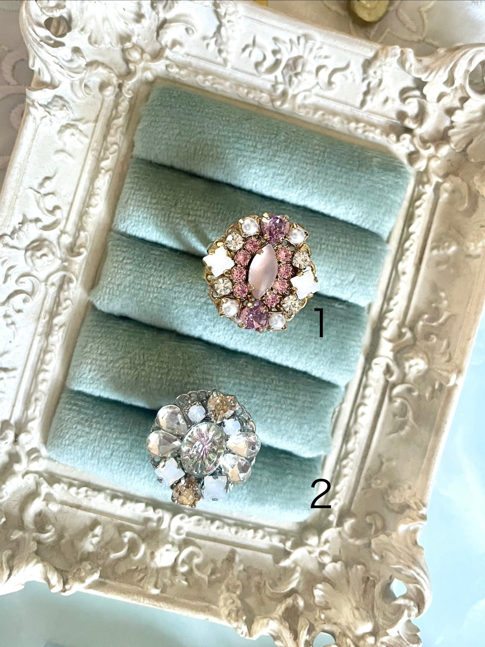 ヴィンテージのパーツやガラスを使って柔らかい色味で仕上げています