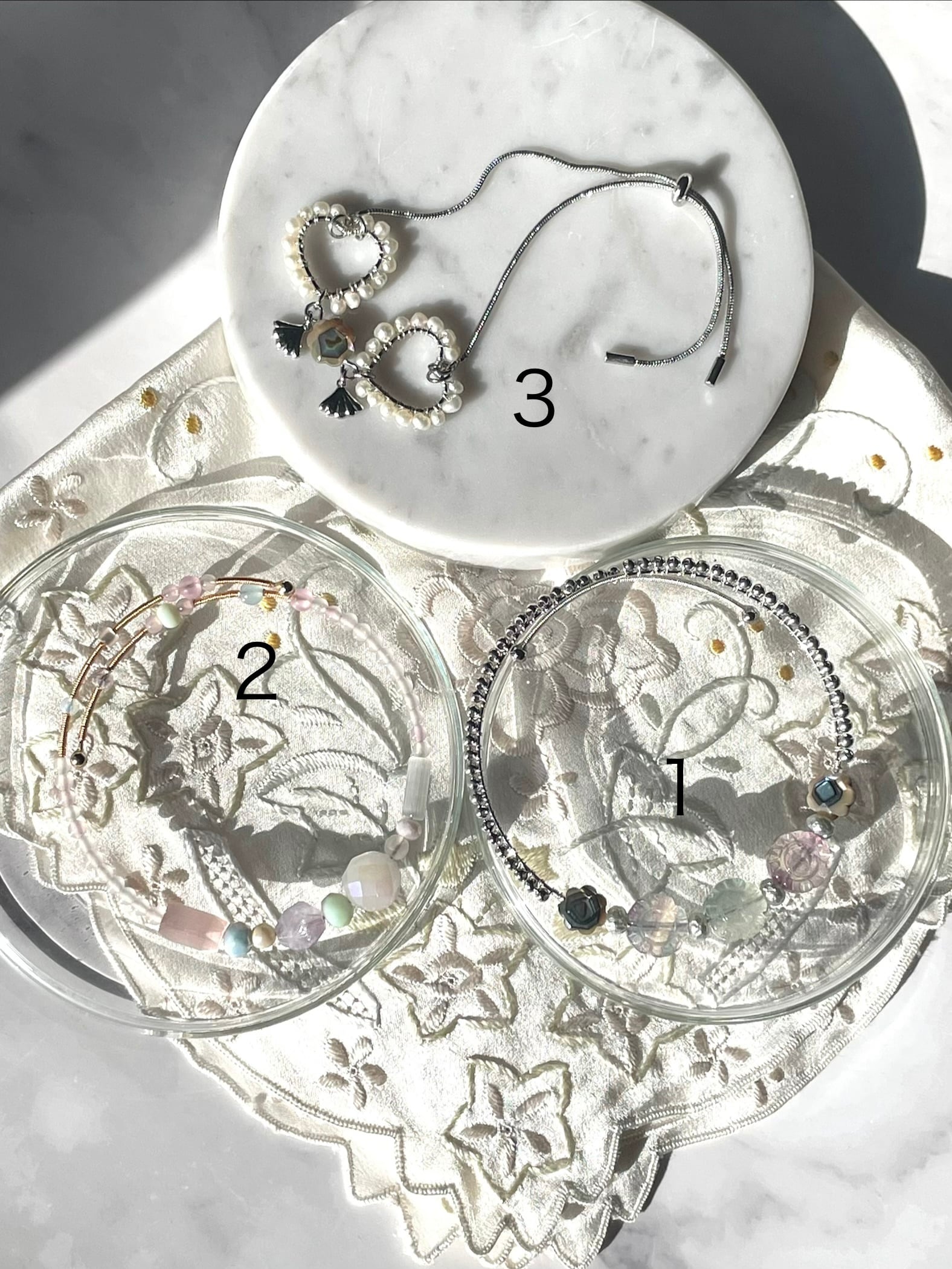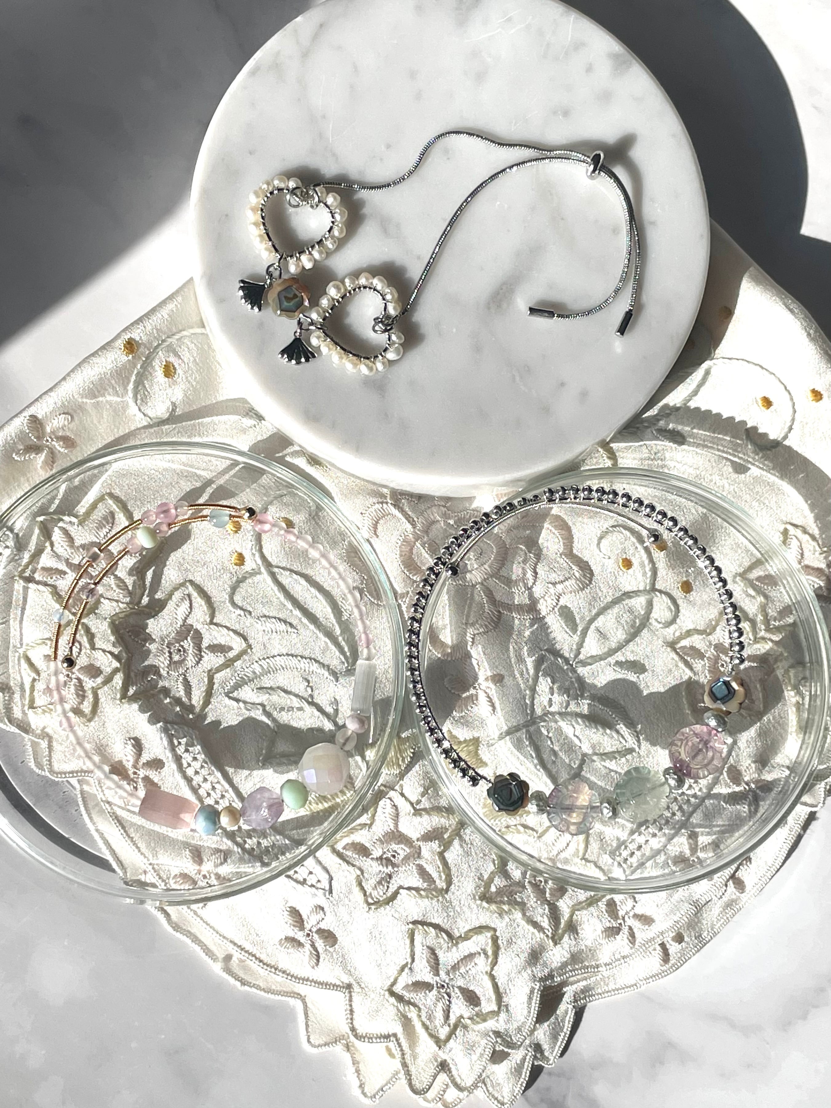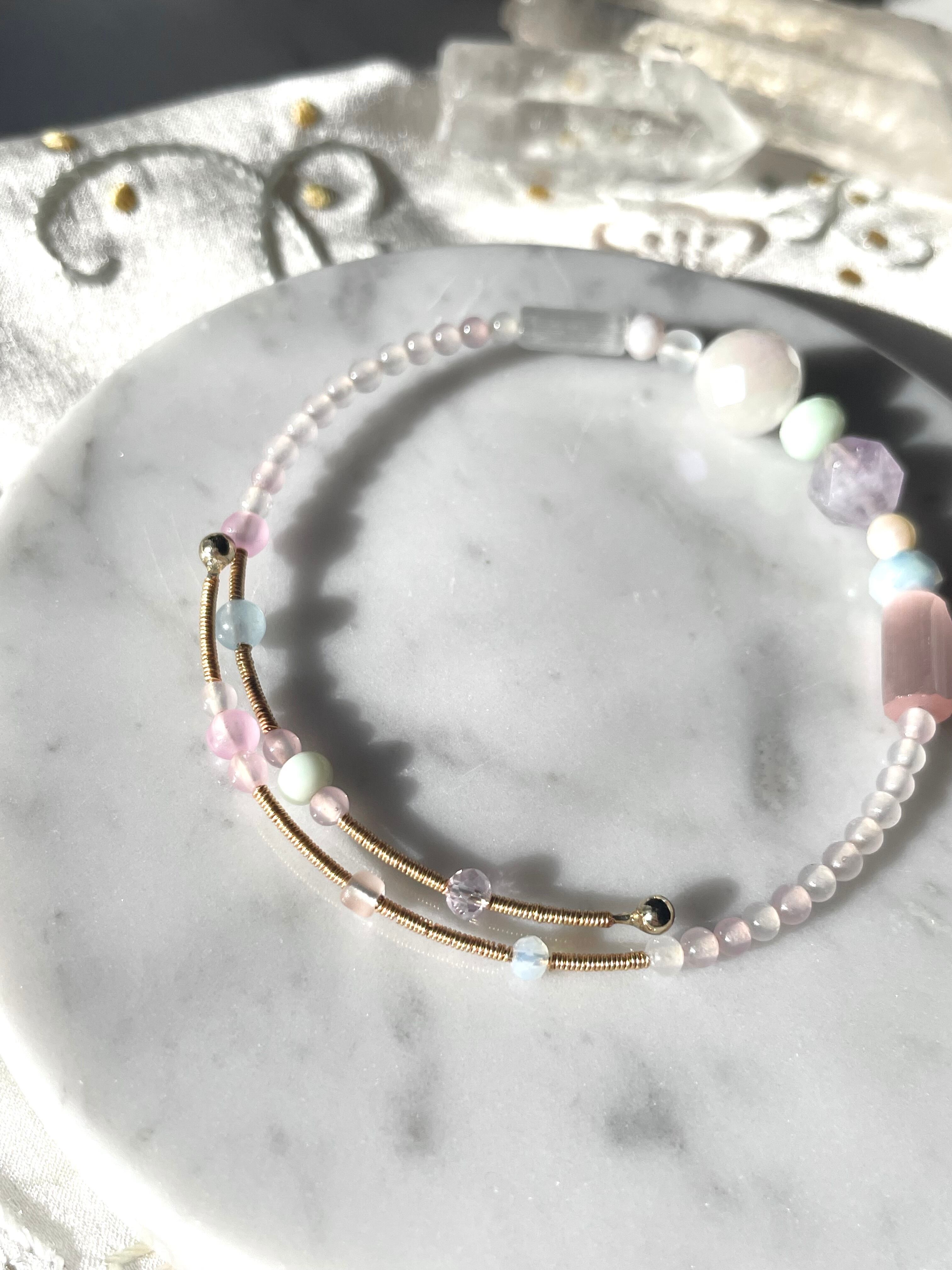 2 素材:ガラス、真鍮、ローズクォーツ、アメジストなど ※ガラスビーズにヴィンテージの素材を使用しています