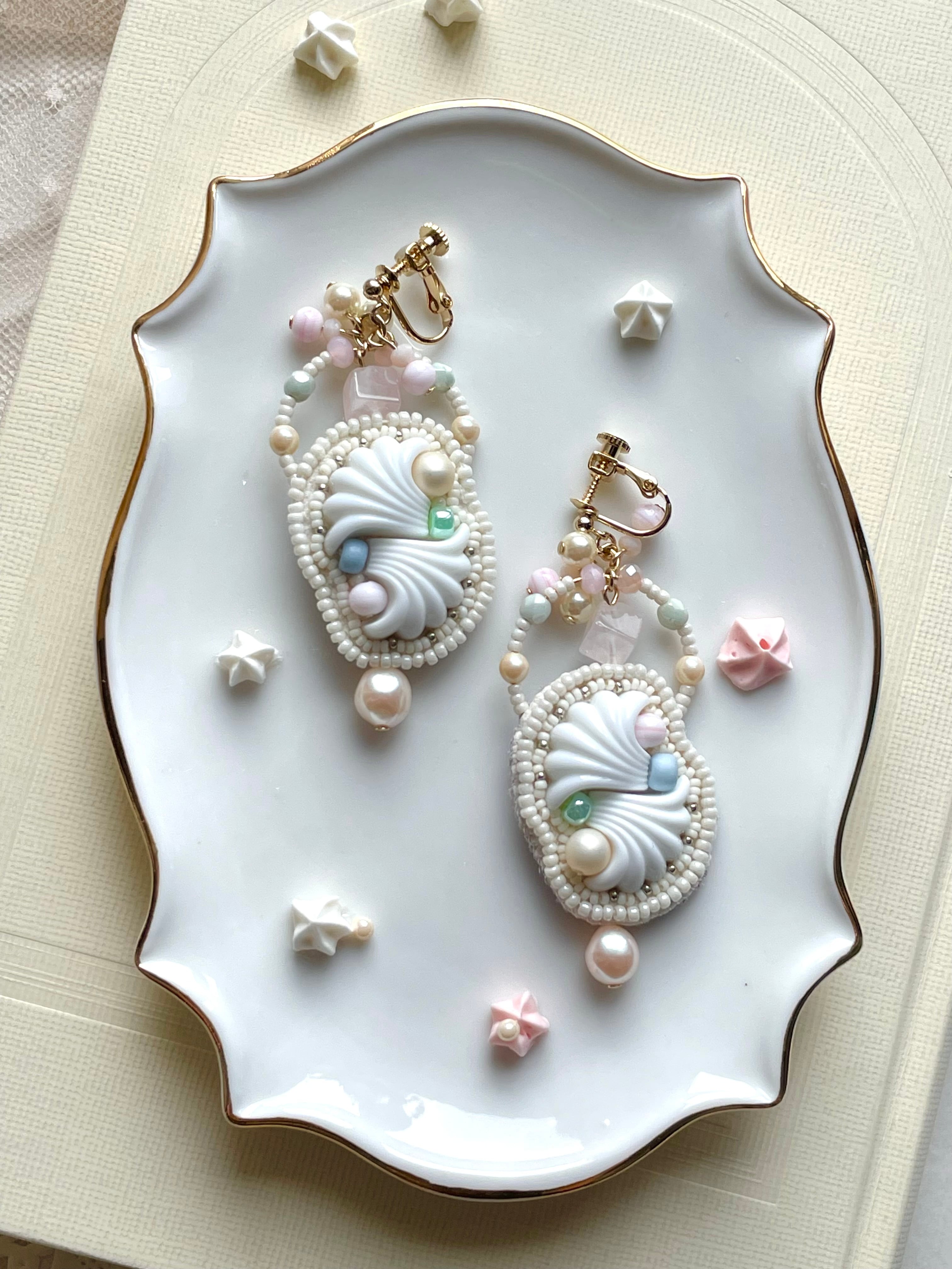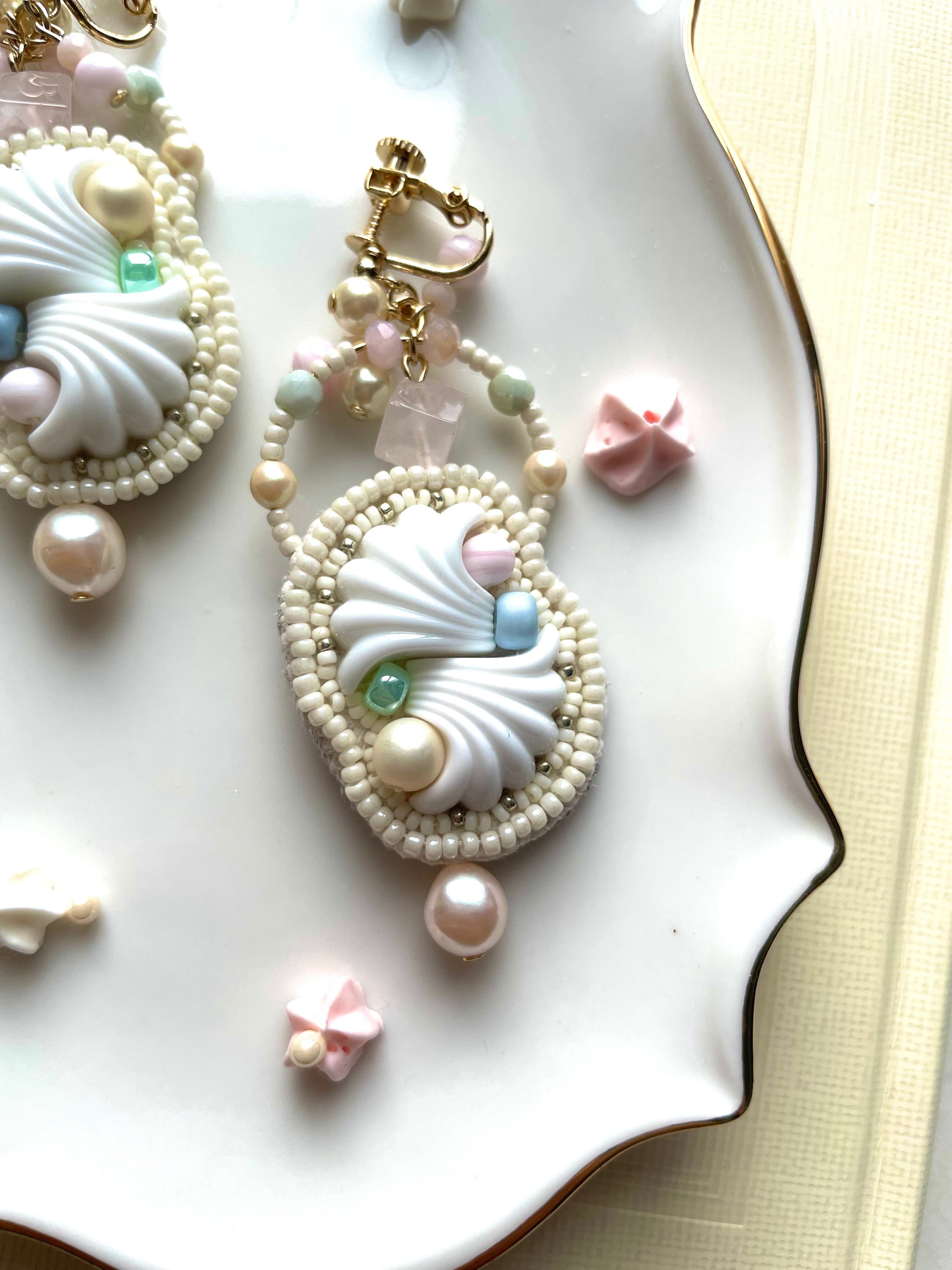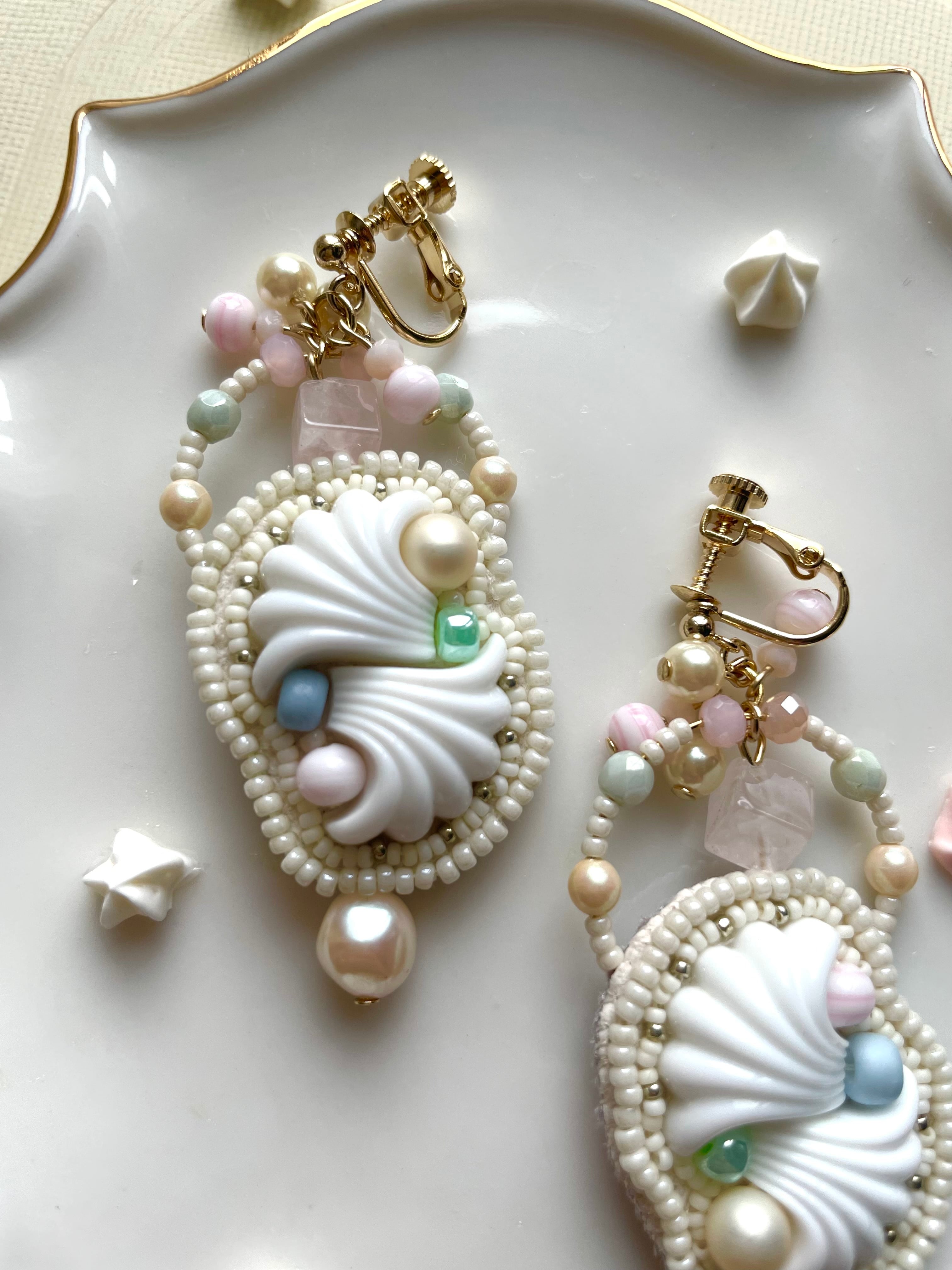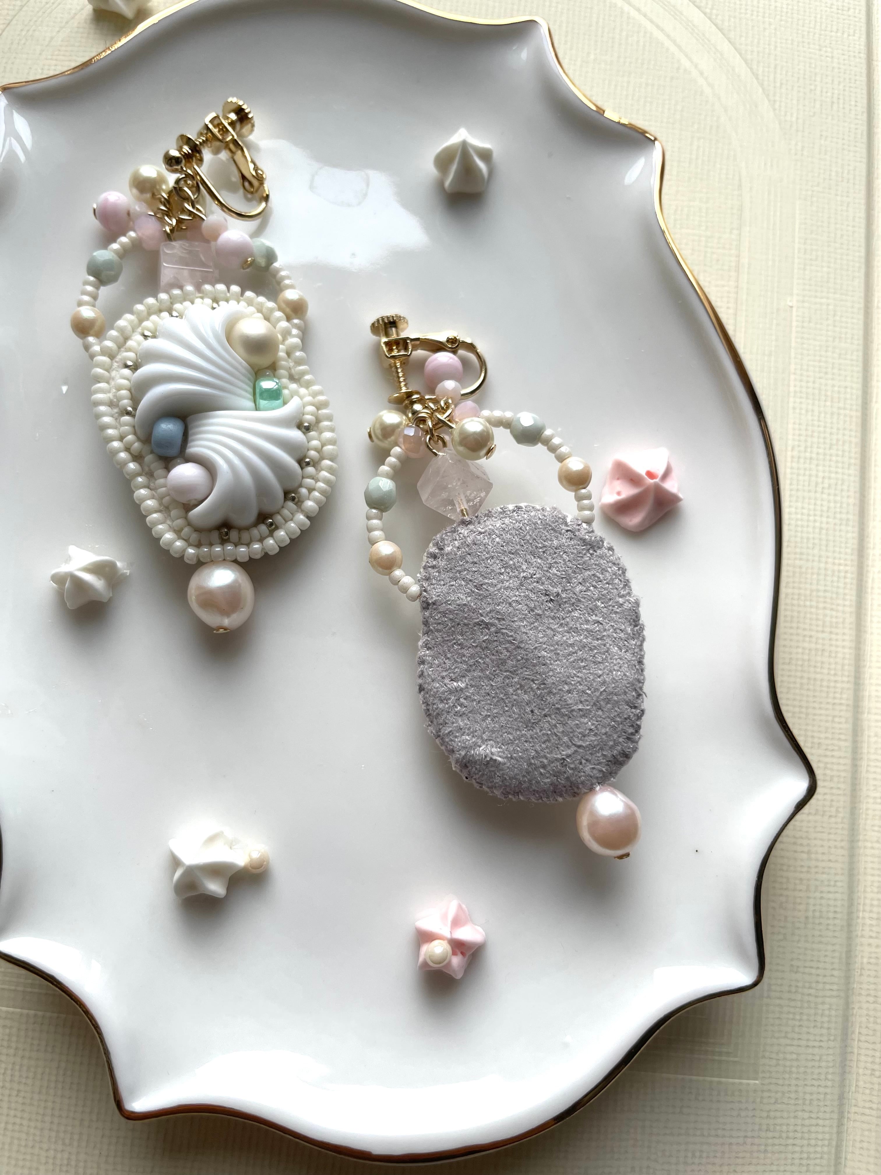 メレンゲ菓子が並ぶお菓子屋さんをイメージした耳飾りです 裏地はしっとりとしたグレーのフェイクスエードで仕上げています