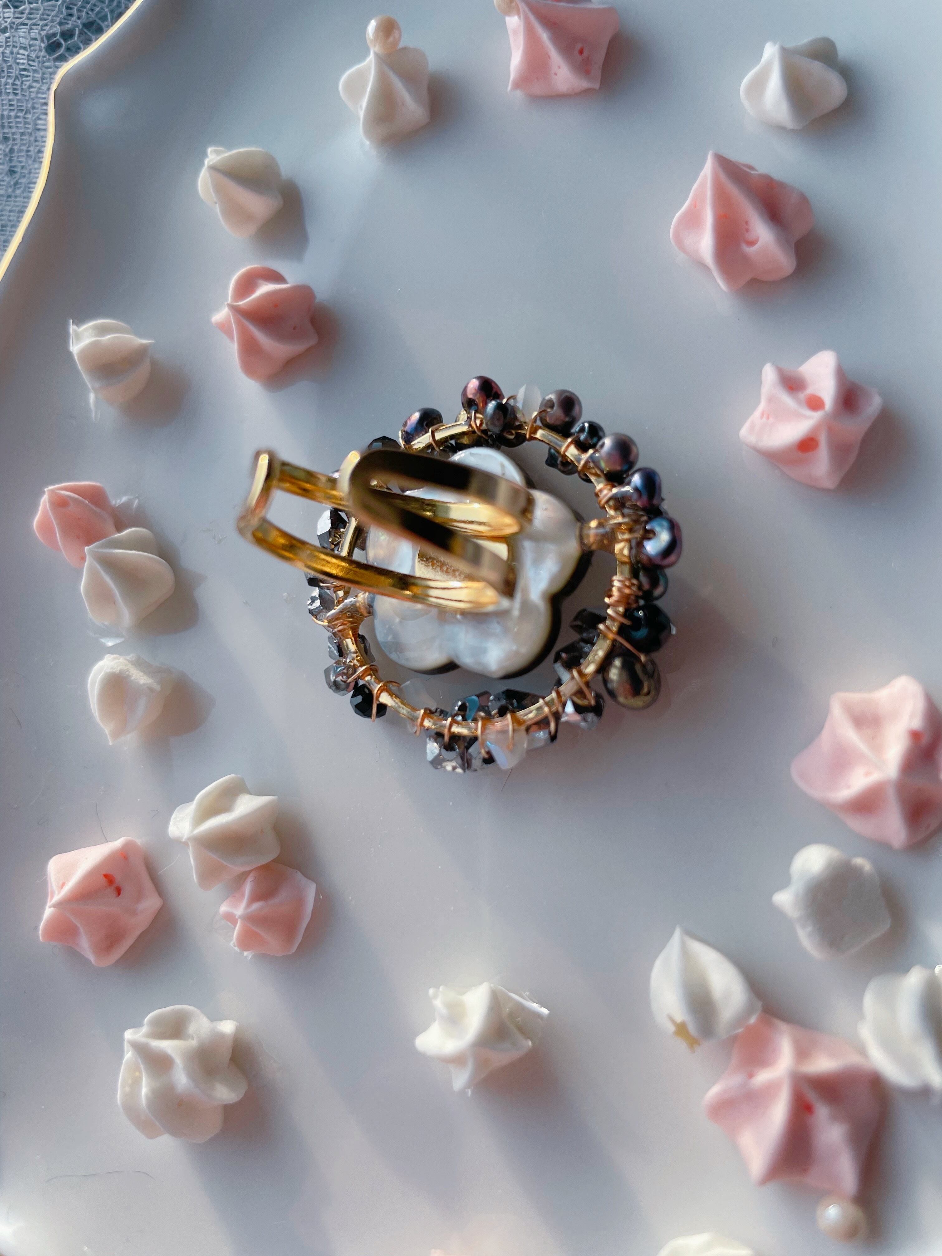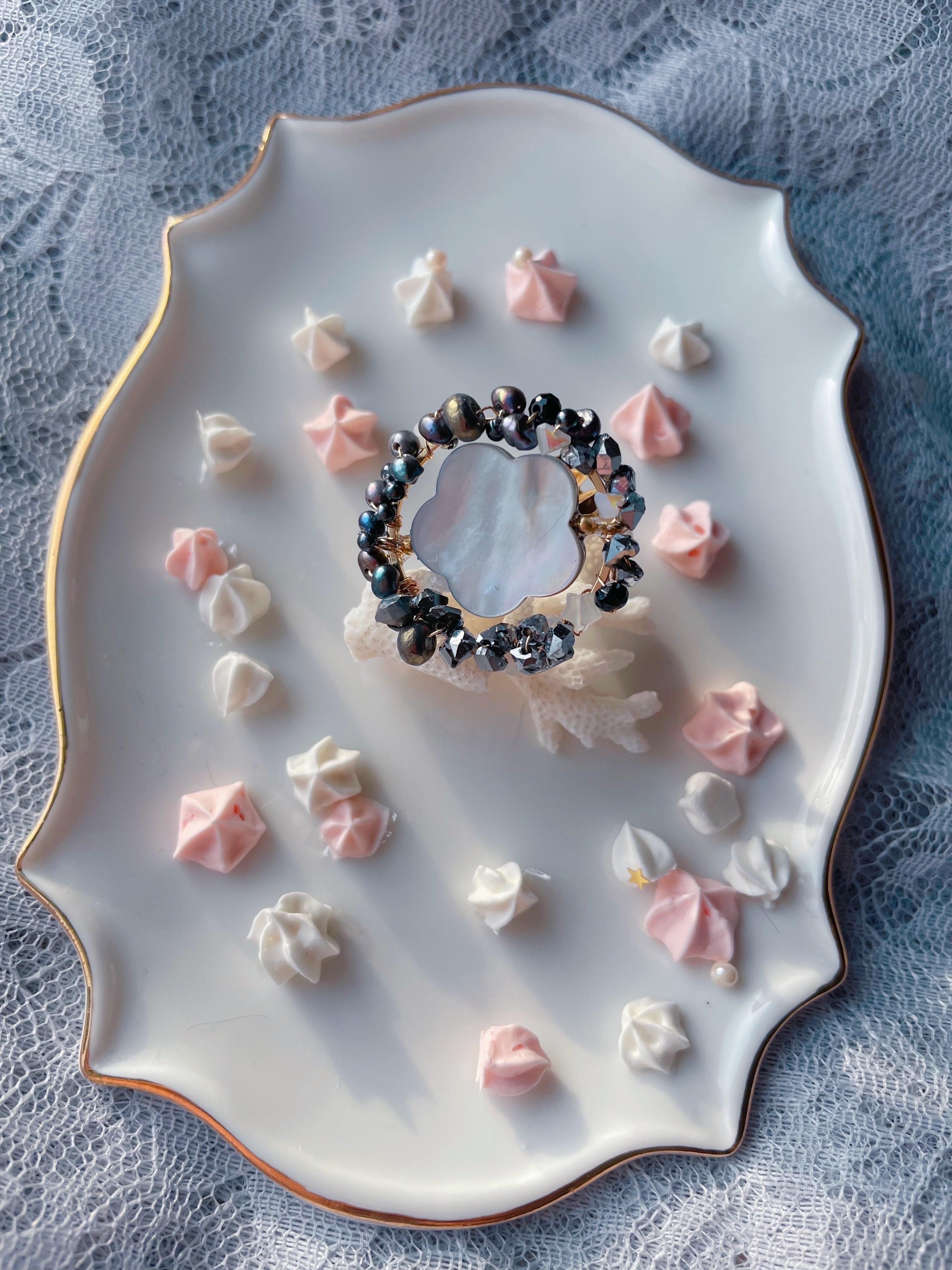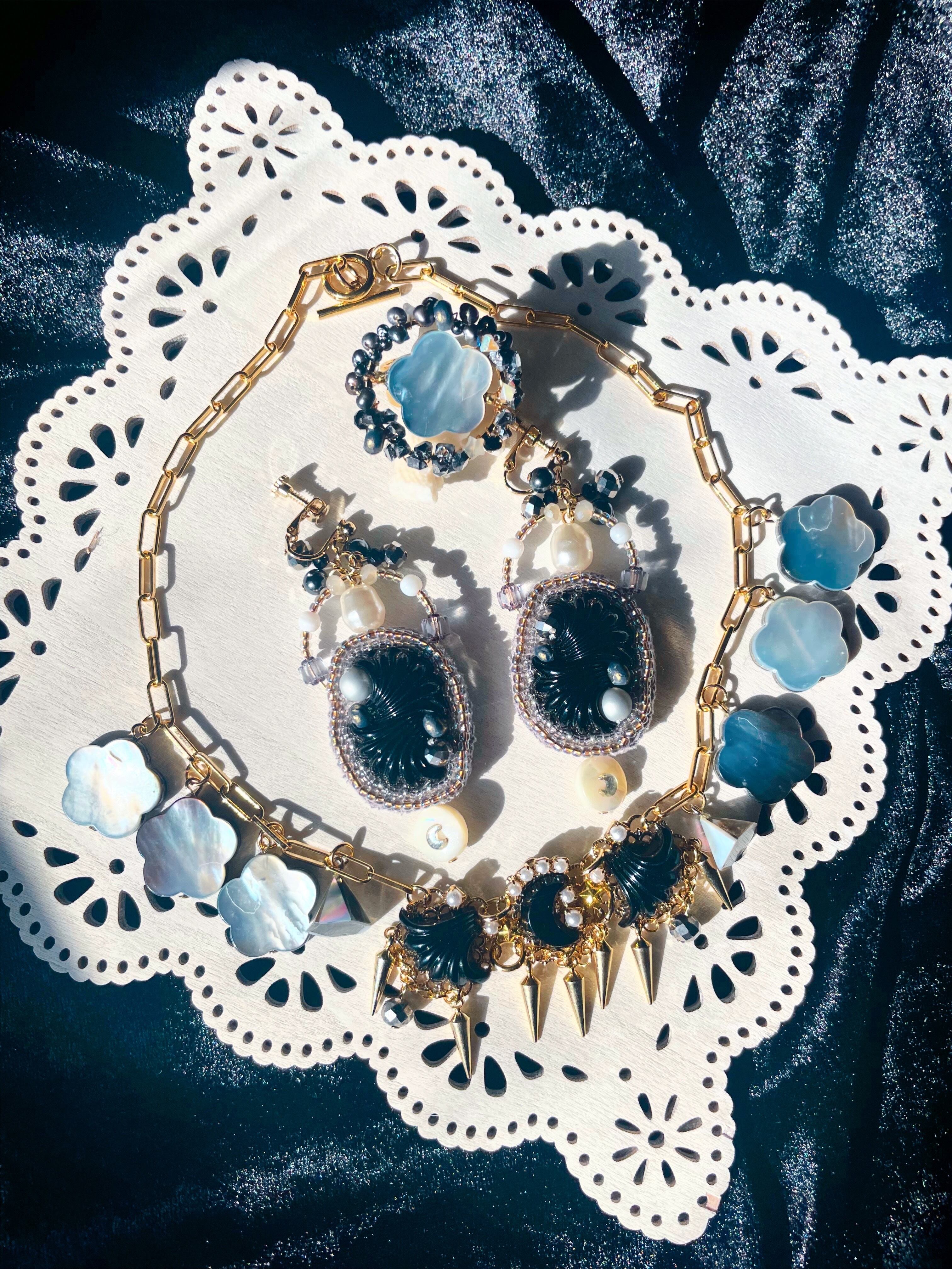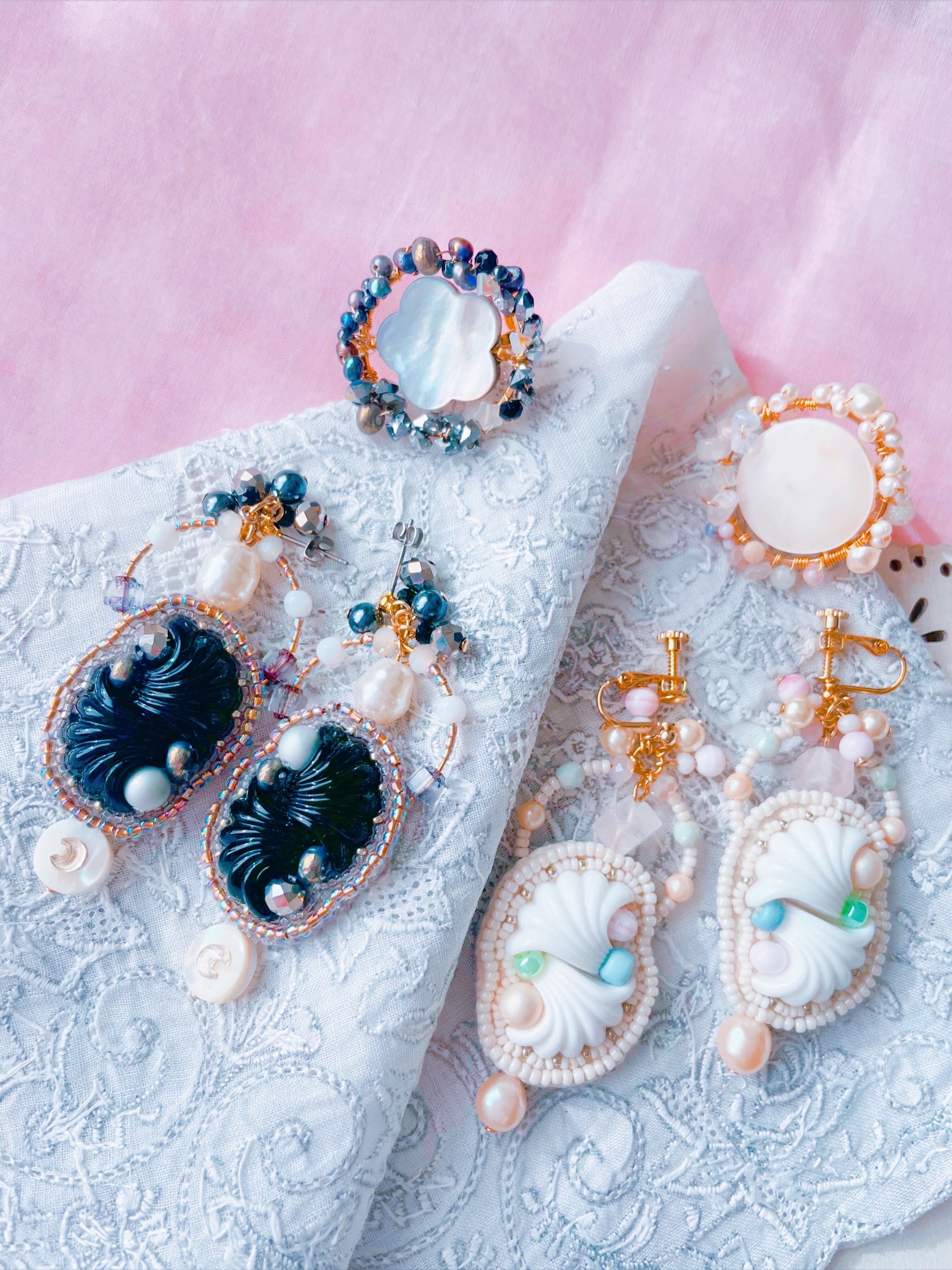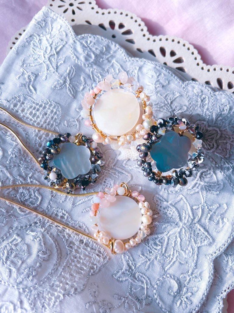 素材:貝、淡水パール、ガラス、半貴石、真鍮など