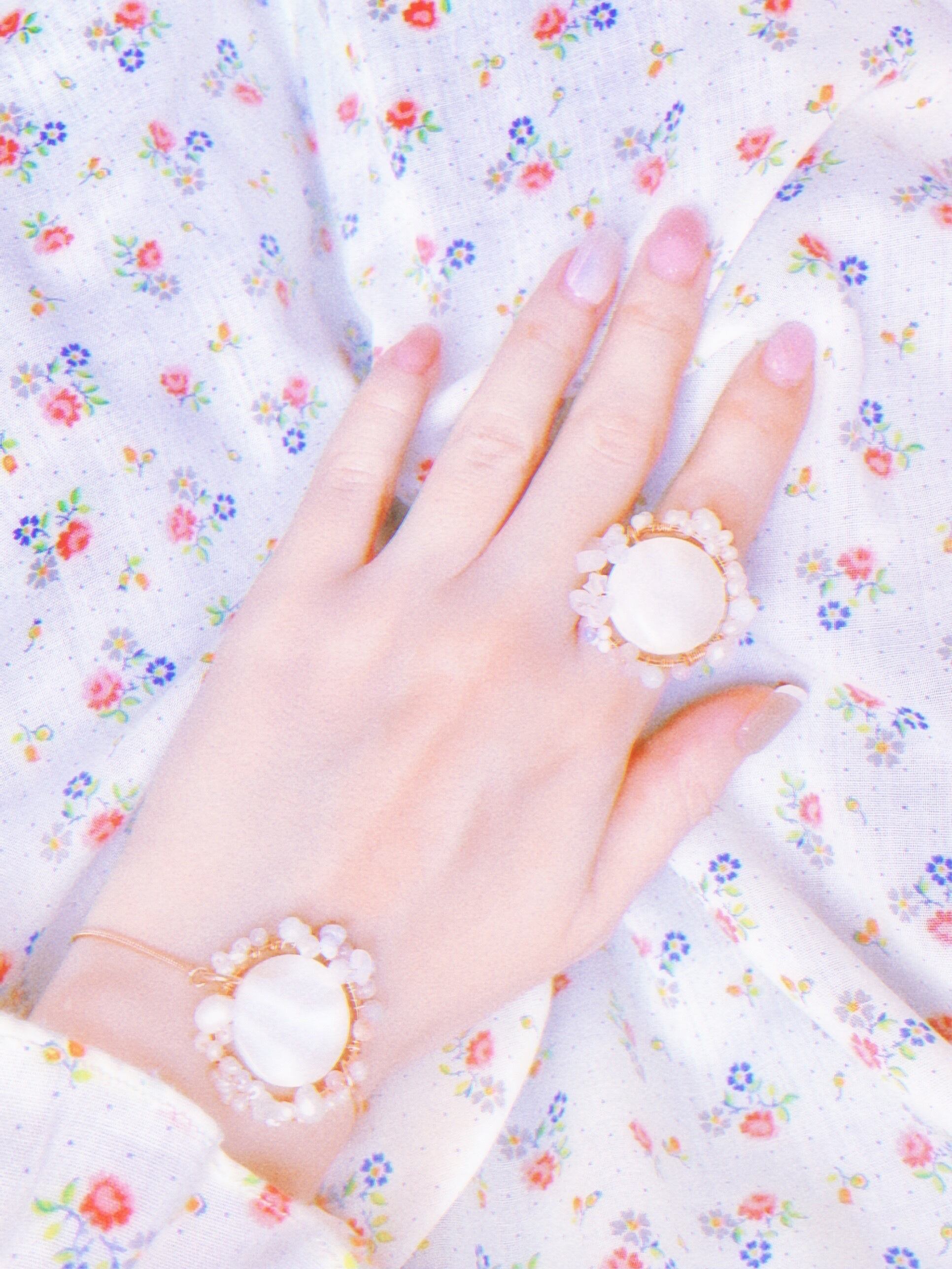 素材:貝、淡水パール、ガラス、半貴石、真鍮など